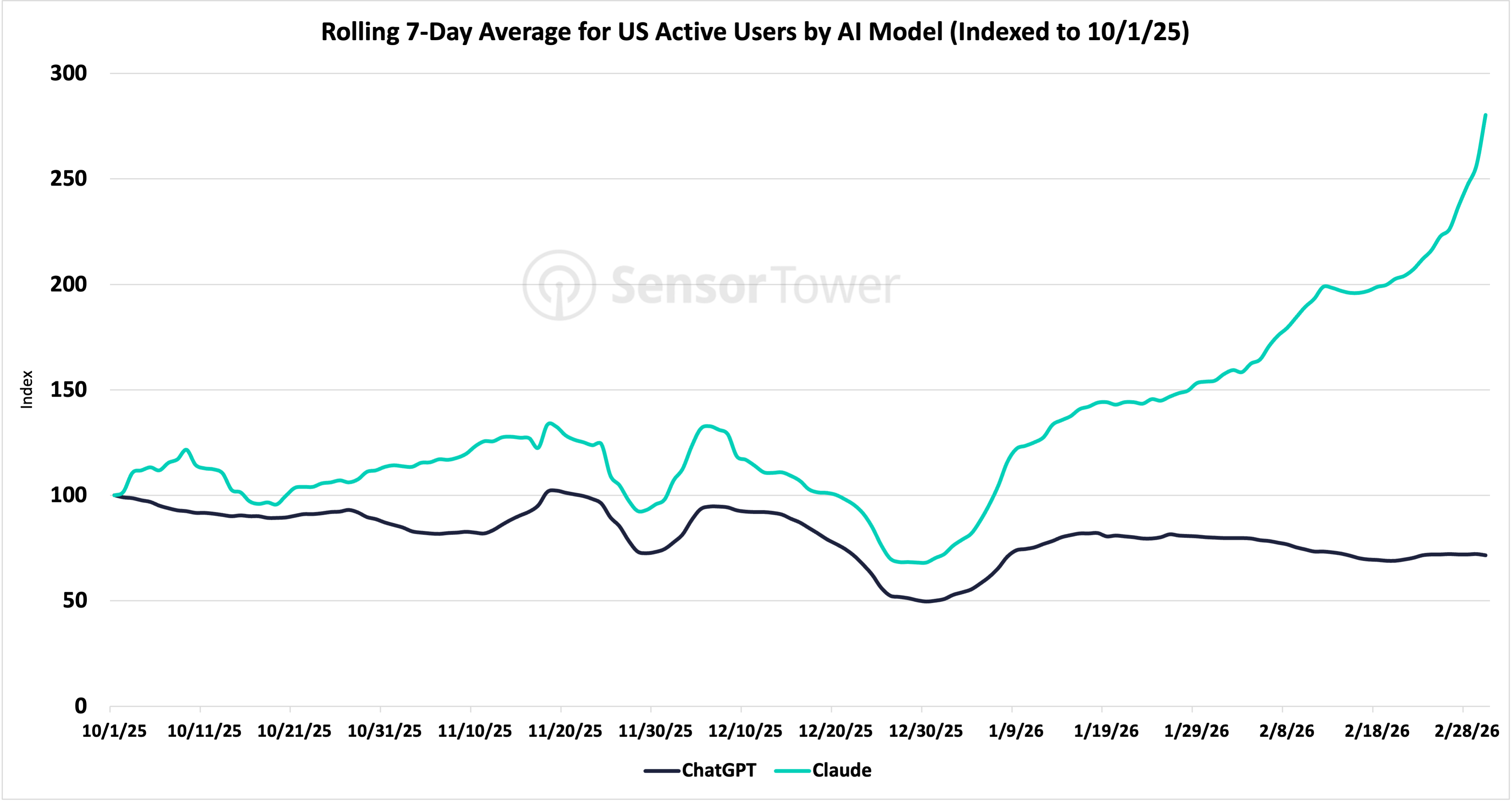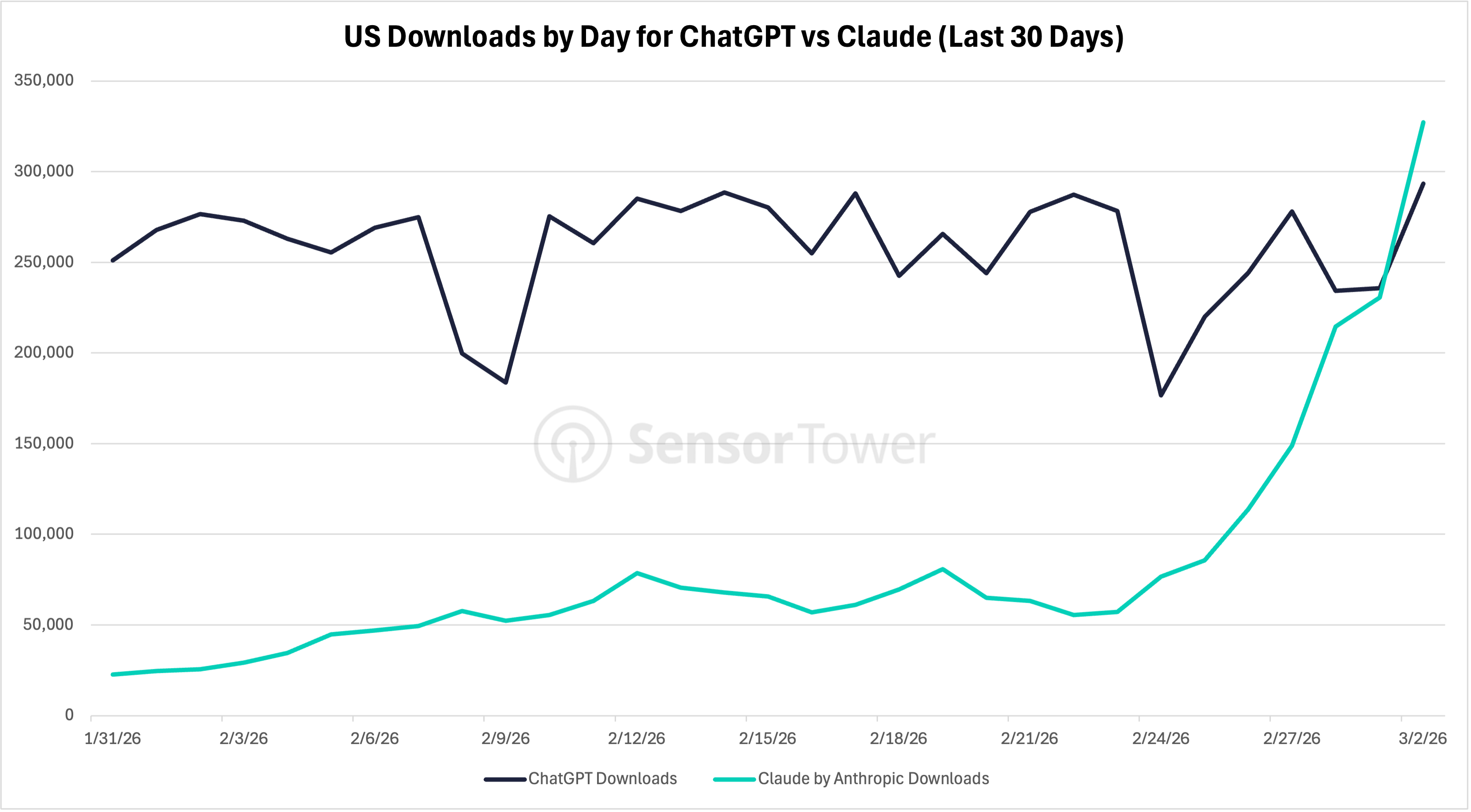 Per Sensor Tower data, Claude saw US downloads jump 37% and 51% DoD on 2/27/26 and 2/28/26, respectively, aligning with the news that the company would not partner with the Department of War.