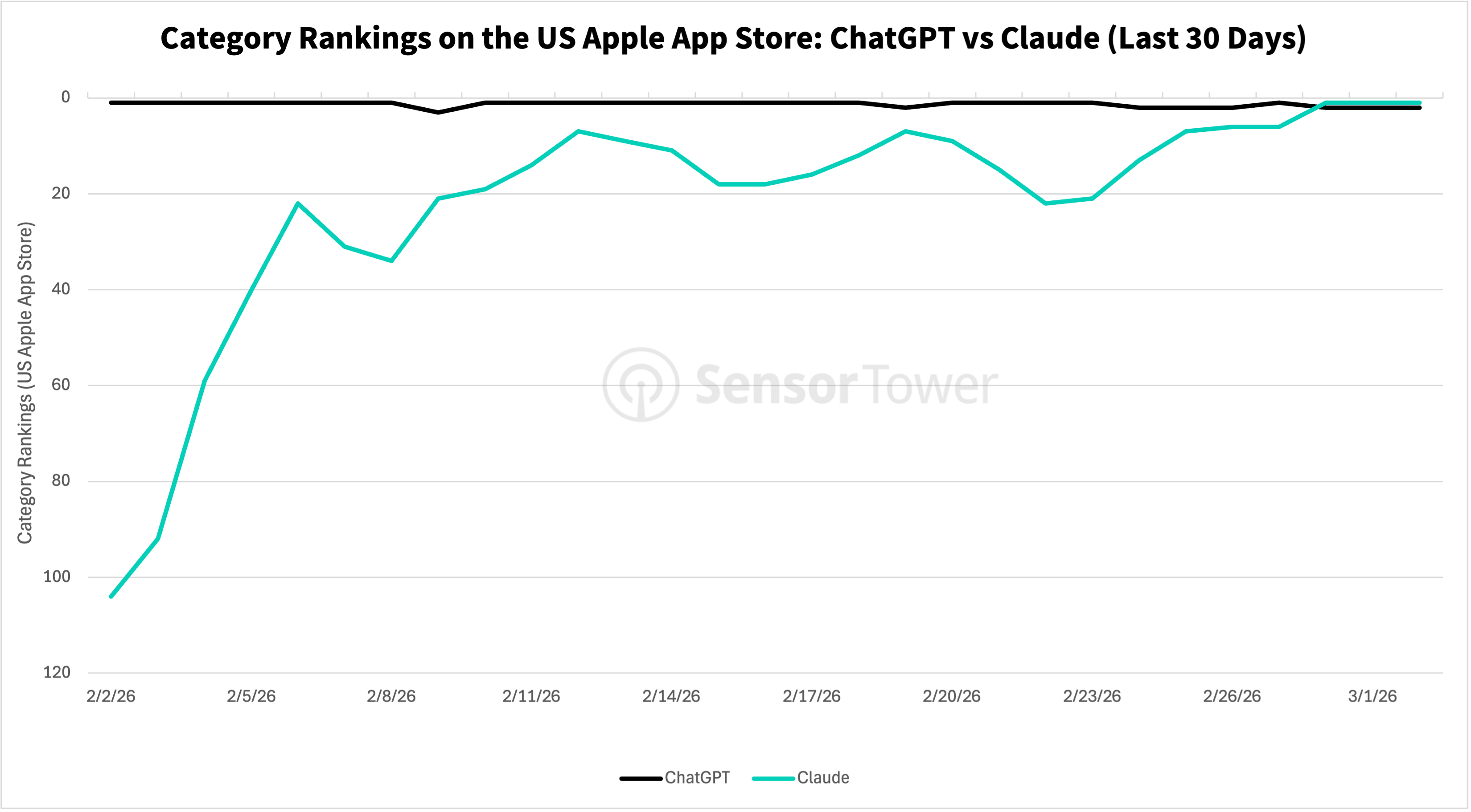 According to Sensor Tower estimates, Claude’s announcement that it would not partner with the Department of War coincided with the app reaching the top spot on the Apple App Store in the US on Saturday (2/28/26). Claude has continued its reign on the top of the charts, remaining in the top spot for the past 4 days, while ChatGPT has dropped one spot during the same period (ranking 2 on the Apple App Store during the same period).