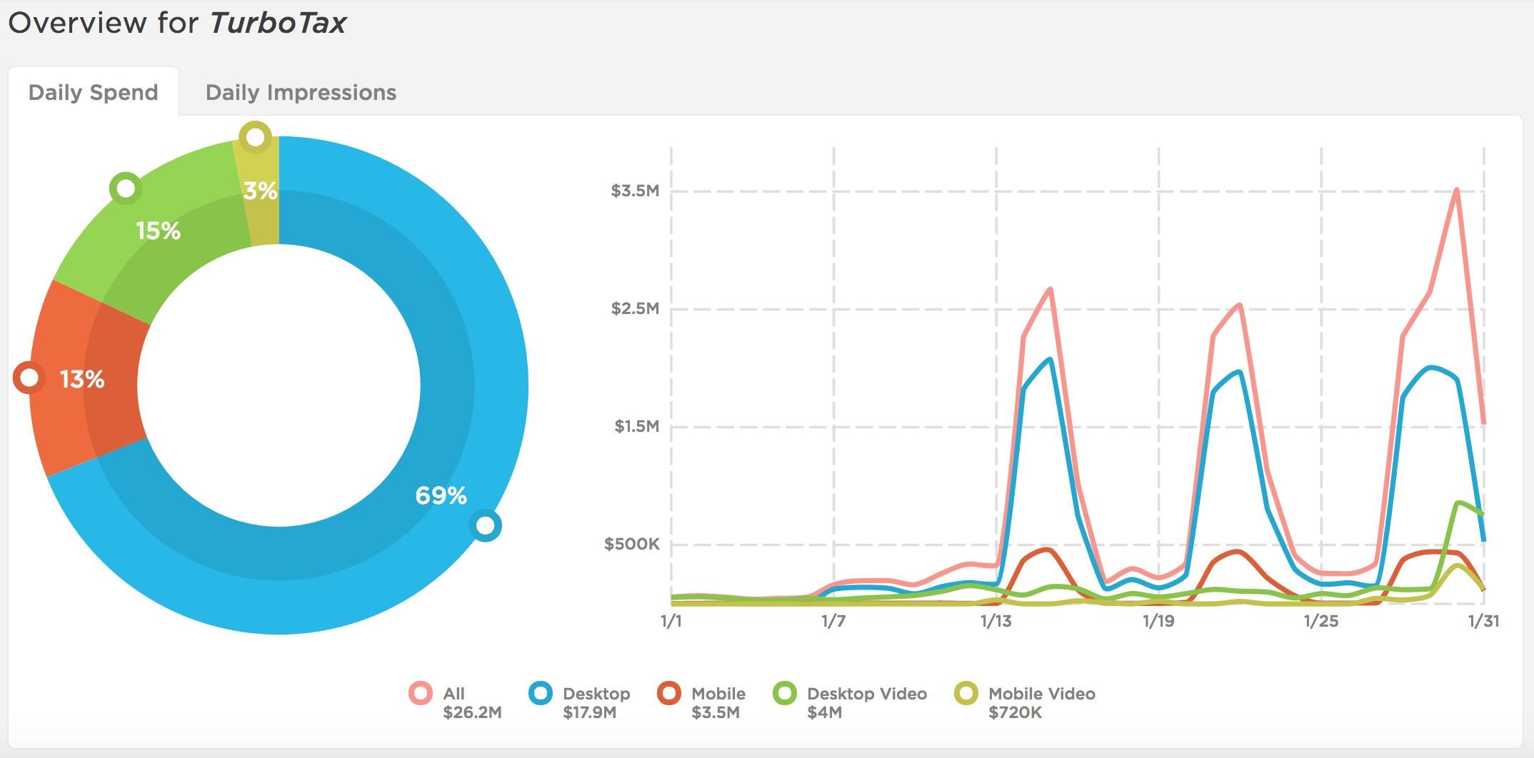 New Year, new taxes to file! In January, brands such as TurboTax and TaxACTbegan their digital campaigns to kick off tax season, each attacking separate device types to gain brand awareness. TurboTax invested the most on digital out of the tax sector, coming in as the top digital spender overall across desktop, mobile, desktop video, and mobile video. The gloves are officially off as tax software brands battle it out until early April. What’s even more interesting is the spend patterns we identified below from the top tax spender.