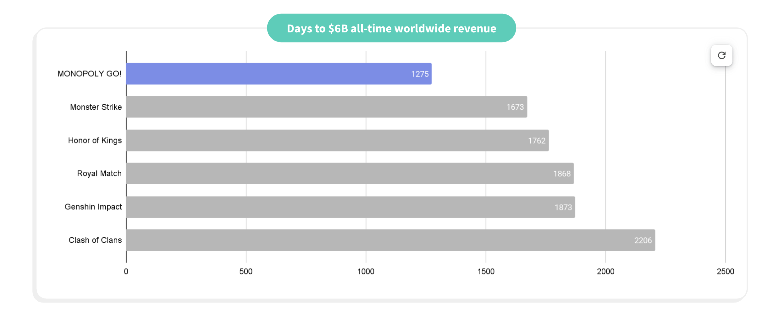 No other title has reached the $6 billion lifetime IAP milestone this quickly. The game's trajectory marks a defining moment for the category, establishing “MONOPOLY GO!” as a transformative release that pushed its genre forward, elevated the MONOPOLY franchise globally, and accelerated Scopely’s rise into the industry’s upper tier. The speed of its rise is unprecedented—even among the most successful games ever released. The game’s days-to-$6 billion curve sits well ahead of legacy top-grossers such as “Monster Strike,” “Honor of Kings,” “Royal Match,” and “Clash of Clans.” According to Scopely, the game continues to generate approx. $200 million per month, underscoring the sustained, global momentum behind the title.