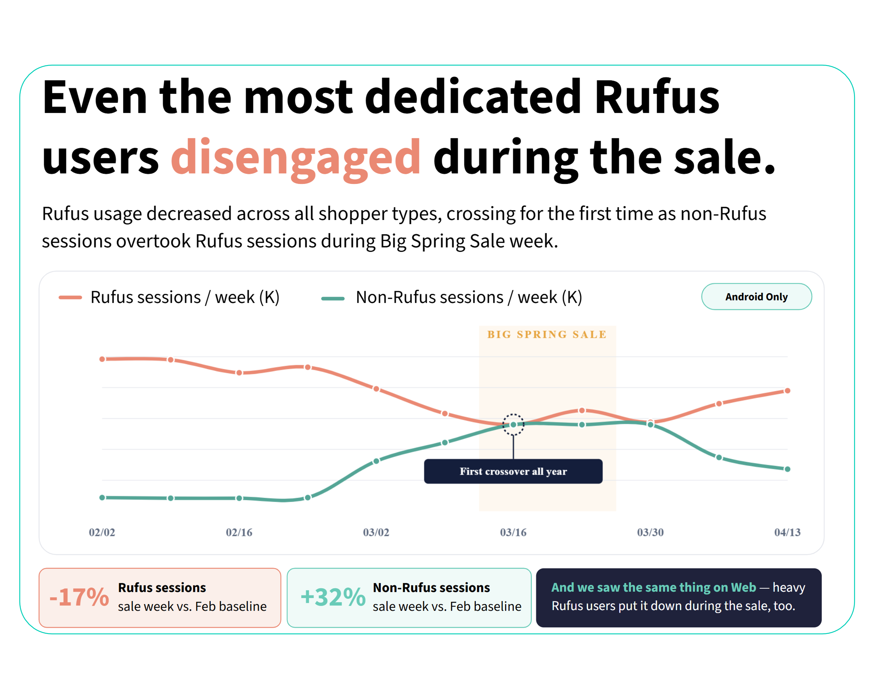 But that signal isn’t constant. During Amazon’s Big Spring Sale, even heavy Rufus users temporarily abandoned it. Rufus engagement dropped while traditional browsing surged, reinforcing a key dynamic: when shoppers are deal-hunting, they don’t engage in search. They’re not there to research or investigate. They’re there to browse, to meander, to check out the shelves, and when they’re done, many just leave, no conversion. Across the board, conversion rates softened. The intent signal weakened because the mindset changed.