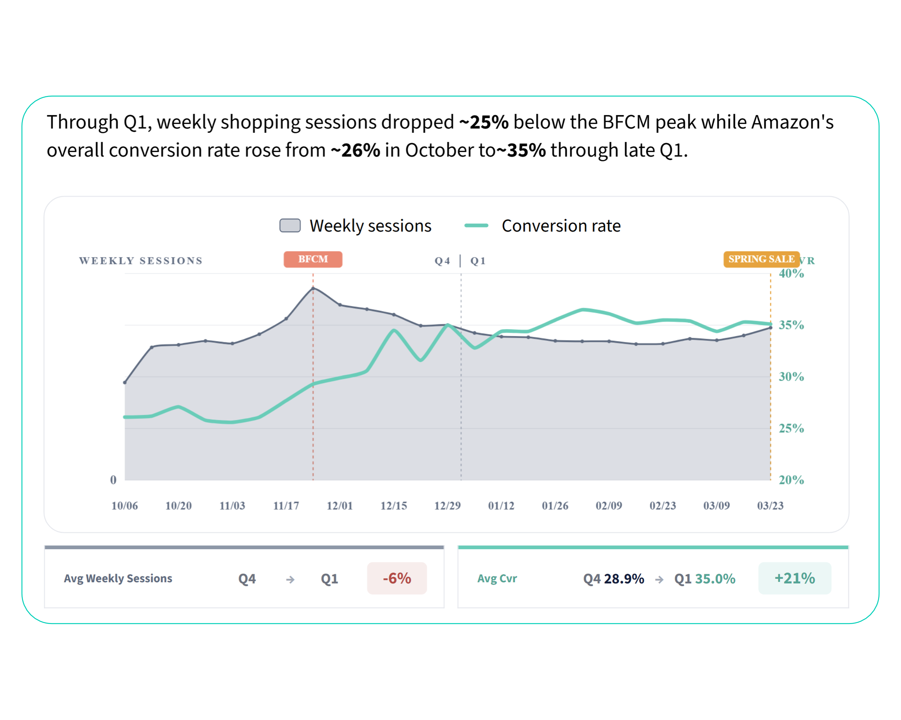 That distinction becomes even clearer post-holidays. In Q1 2025, total shopping sessions declined, but conversion rates jumped from 26% to 35%. Fewer visits, more purchases. The reason? High volume, high ambiguity during the holiday season. Shoppers shifted from browsing and wish-listing to buying. The same users who were casually comparing gifts in December returned with specific needs in January, and Rufus aligned perfectly with that mindset.