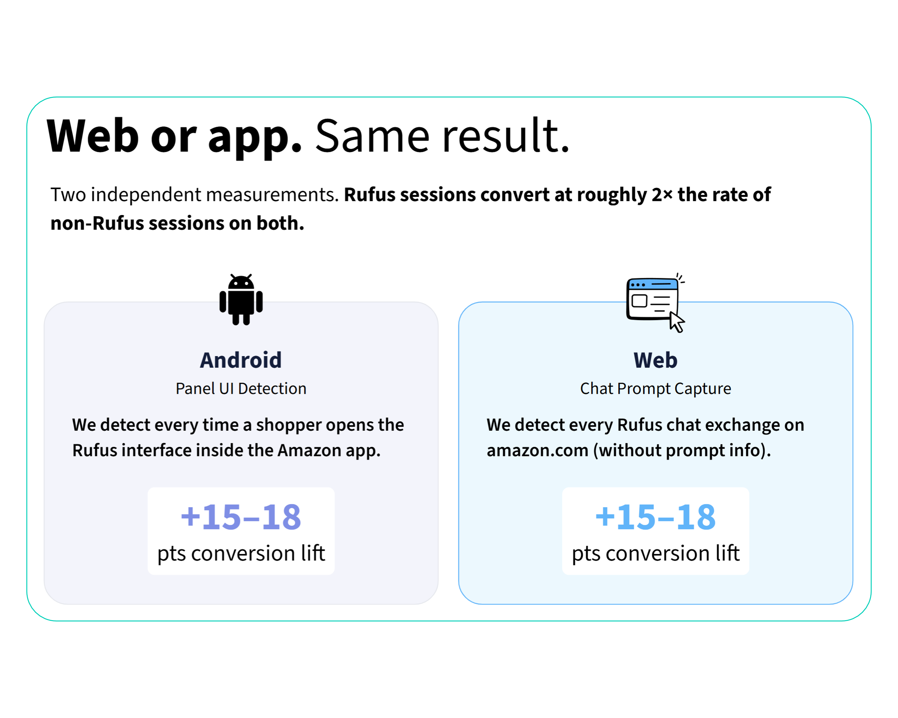Across both web and app environments, the pattern holds. Rufus sessions consistently deliver roughly double the conversion rate of non-Rufus sessions, confirming that this isn’t about platform mechanics, it’s about shopper intent. Rufus doesn’t create demand; it reveals it.