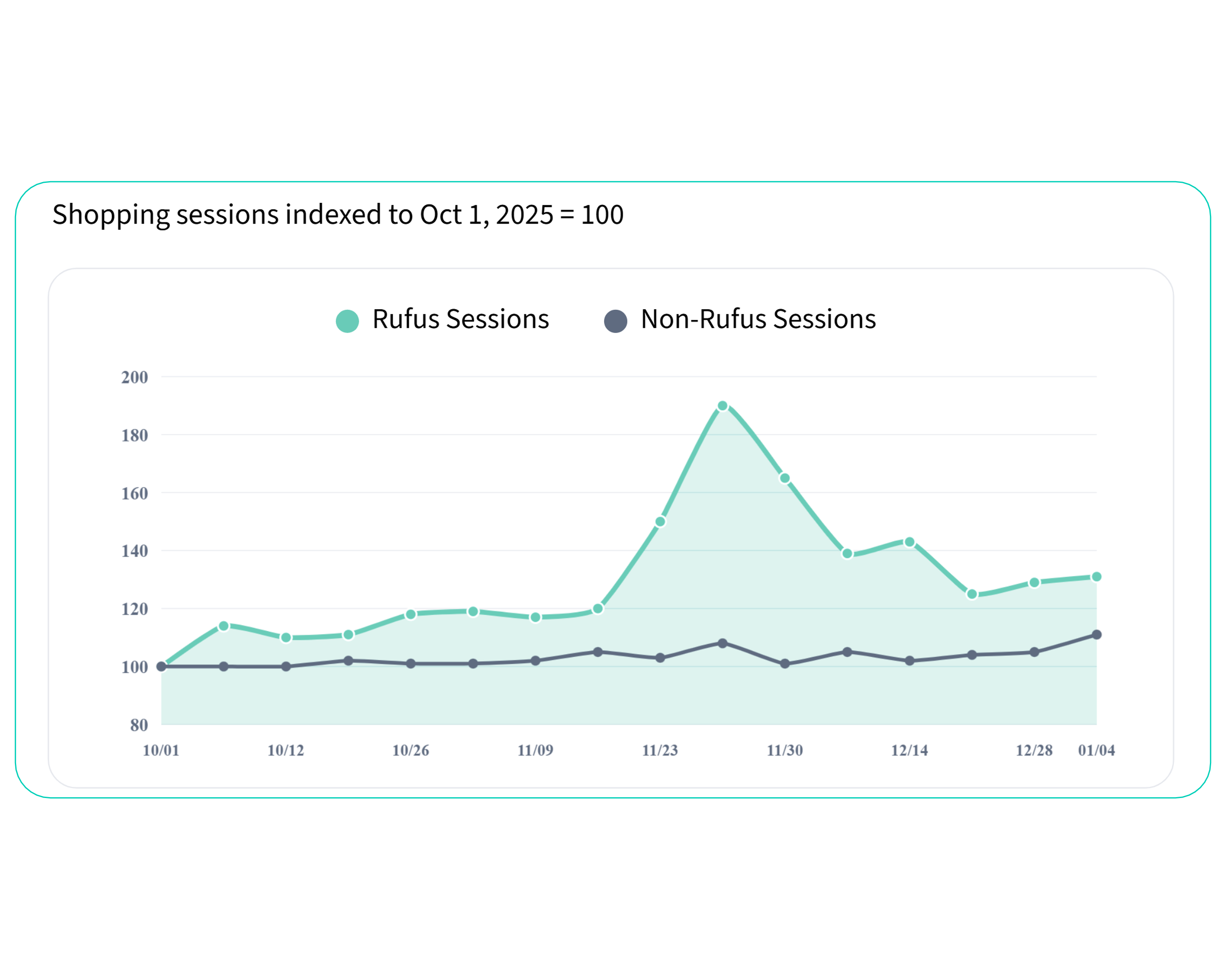 Tracking 60,000 dedicated U.S. shoppers on Amazon across the 2025–2026 sales season, one signal consistently stood out: when shoppers engage with Rufus, they behave differently. Not slightly different, but fundamentally different. During the holiday surge, Rufus-driven sessions climbed nearly 90% from October 2025 levels, while non-Rufus activity was almost stagnant. The spike in shopping wasn’t just more traffic, it was more intent-driven behavior across engagement, and purchase activity.