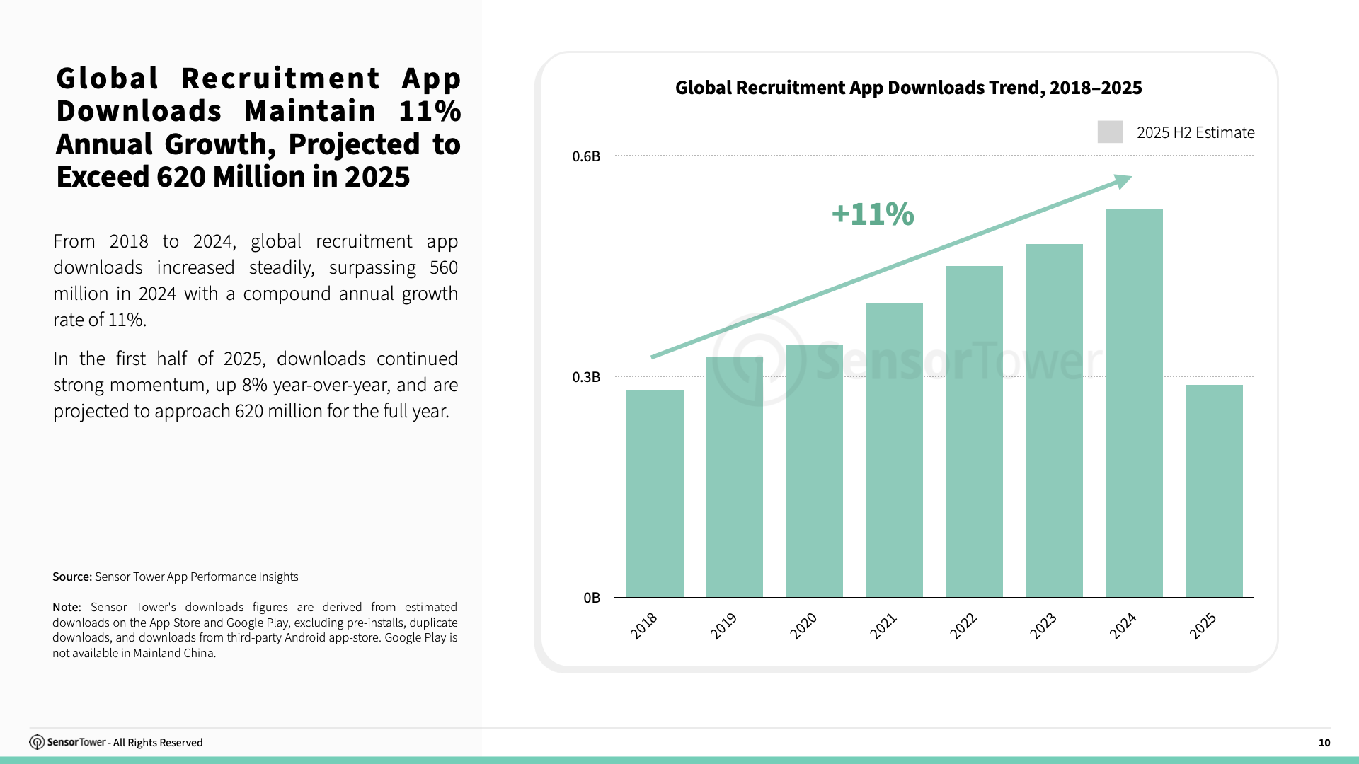 From 2018 to 2024, global recruitment app downloads increased steadily, surpassing 560 million in 2024 with a CAGR of 11%. In the first half of 2025, downloads maintained strong momentum, rising 8% year-over-year, with total annual downloads expected to approach 620 million.