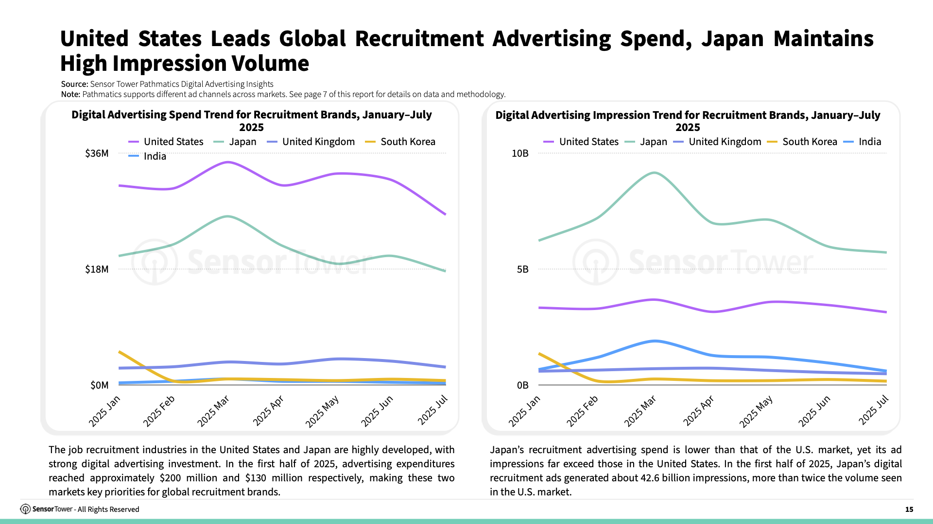 The recruitment sectors in the United States and Japan are highly mature, with substantial digital advertising investment. In the first half of 2025, ad spending reached approximately $200 million and $130 million respectively, making these markets the primary focus for global recruitment brands.