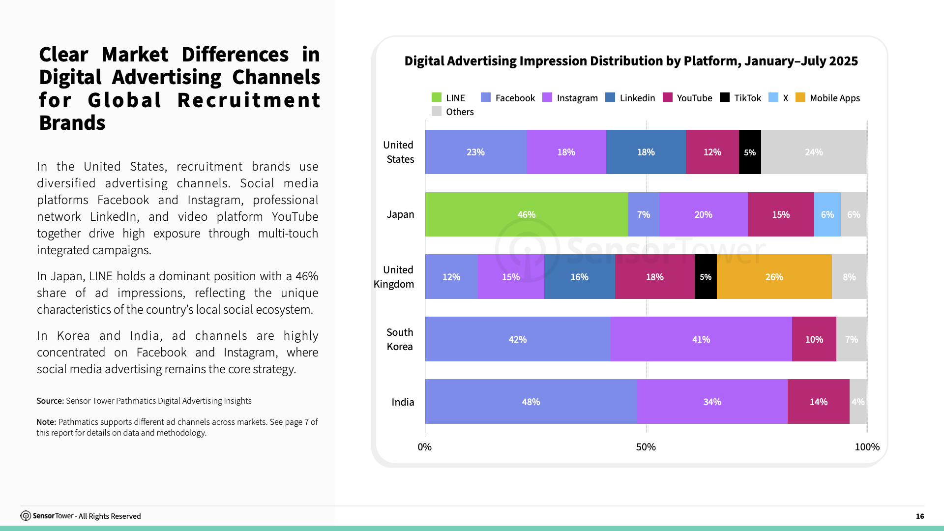 In Japan, LINE dominates the market with a 46% share of ad impressions, reflecting a distinct domestic social ecosystem. In Korea and India, ad channels are heavily concentrated on Facebook and Instagram, where social media advertising remains the core strategy.