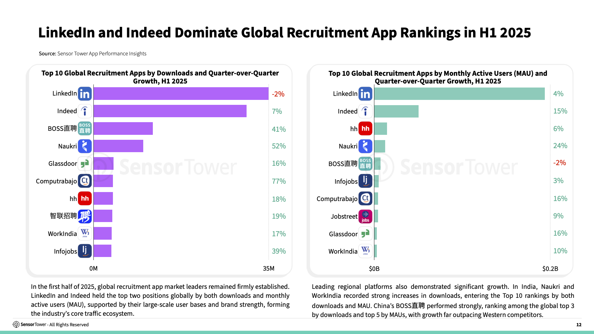 Regional leaders also performed strongly. BOSS直聘 achieved standout results, ranking third globally by downloads and fifth by MAU in H1 2025, while placing second in revenue, outpacing major Western platforms. 智联招聘 also showed solid performance, ranking eighth globally by downloads.