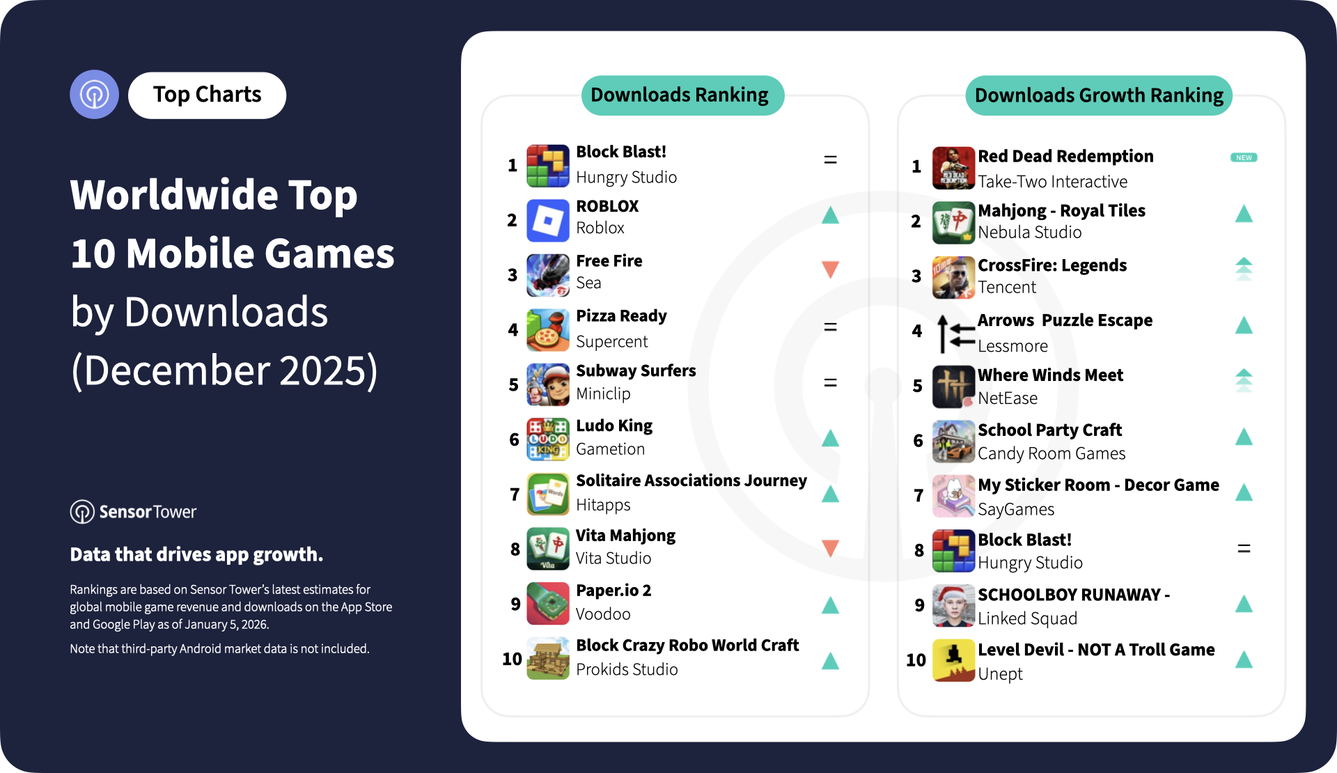 Together, December’s top climbers reinforced the continued importance of accessibility, recognizable IP, and viral-friendly gameplay loops in driving download growth across global markets.