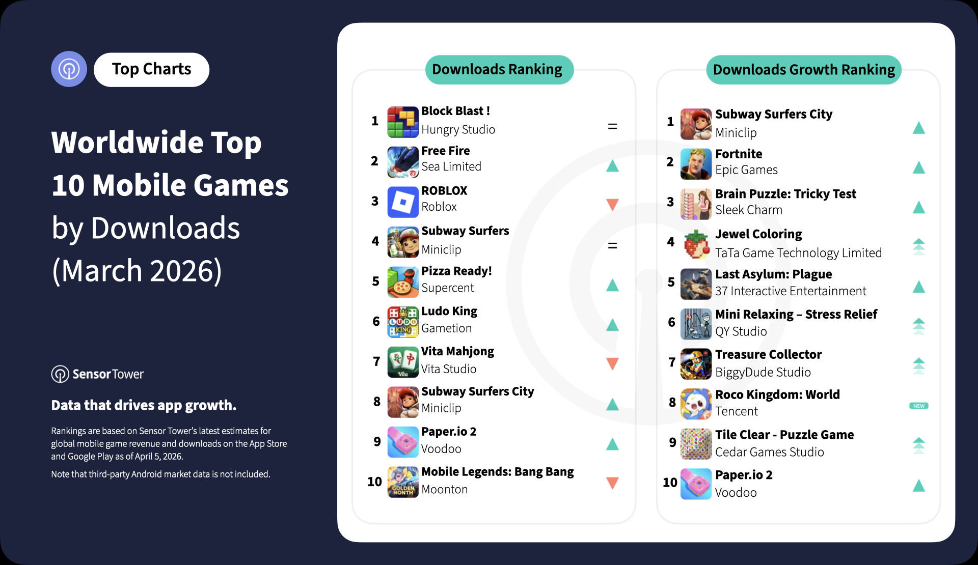 Block Blast! remained the most downloaded mobile game globally in March 2026, maintaining its No. 1 position from the prior period. Free Fire moved up to No. 2, followed by ROBLOX, Subway Surfers and Pizza Ready! completing the top five by downloads.