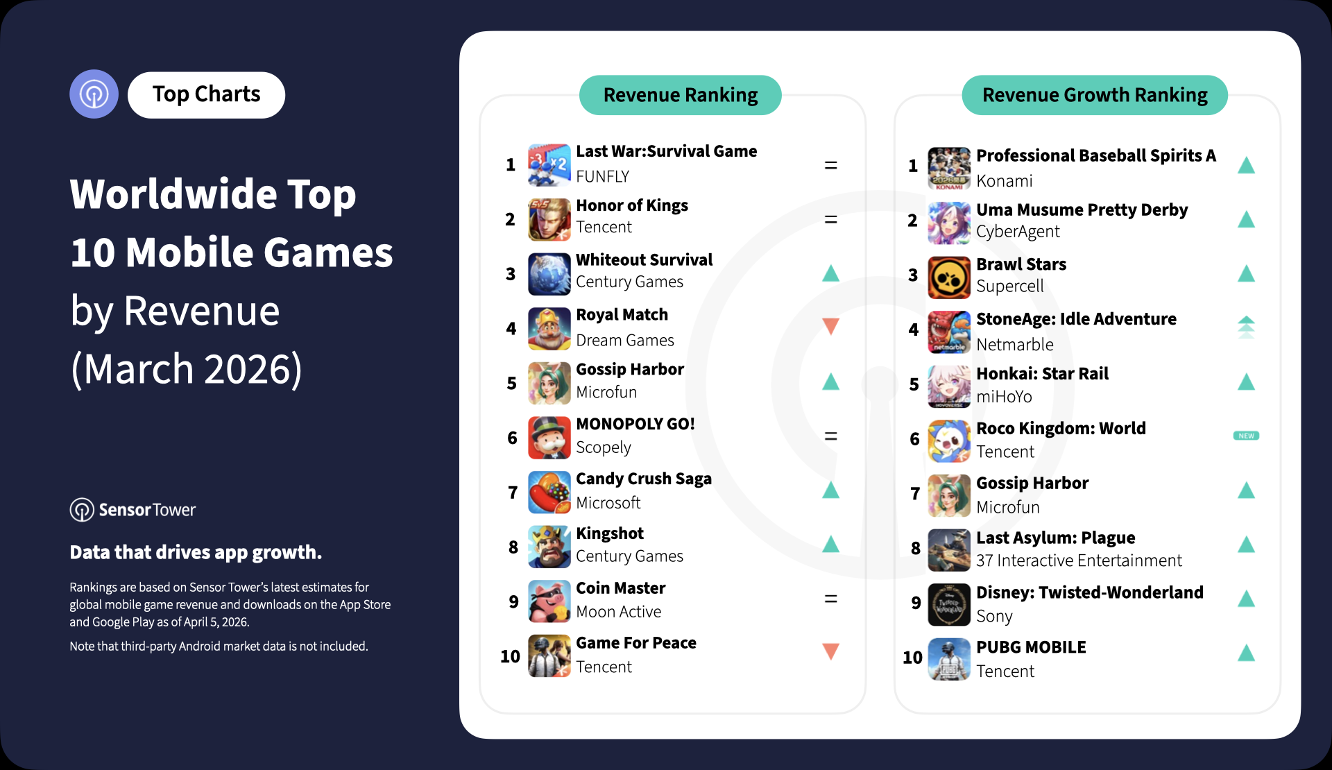 March’s growth charts also showed room for more theme-led and progression-driven titles to break out. Last Asylum: Plague stood out by combining post-apocalyptic strategy with alliance-based progression and competitive base-building, while Roco Kingdom: World highlighted the ongoing appeal of creature collection, exploration, and nostalgic IP-led worldbuilding. Together, these titles show that March’s momentum was shaped not by one dominant genre, but by a mix of strong themes, clear gameplay hooks, and mobile-first accessibility.