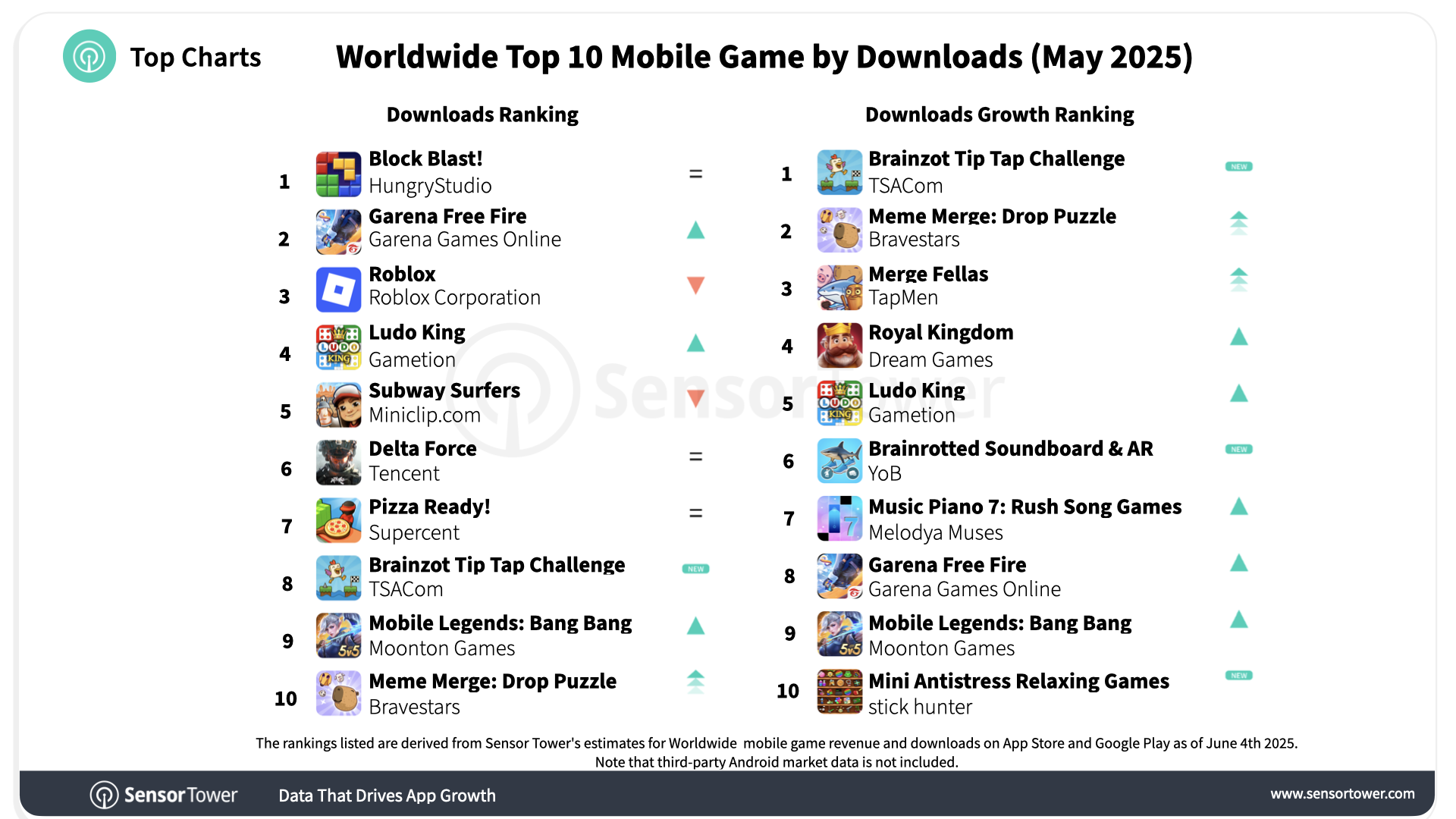 Block Blast! retained its top spot as the most downloaded mobile game globally in May 2025. Garena Free Fire moved up to second place, followed by ROBLOX, Ludo King and Subway Surfers rounding out the top five.