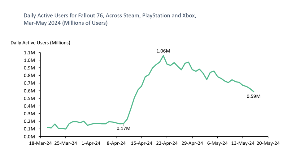 Higher in-game spend in Fallout 76 – Daily active users of FO76 increased from c. 100-200k pre show to peaking at 1M DAU during the show’s launch window across all game’s platforms. This will likely slightly dilute the average revenue per daily active used (ARPDAU) as the new players tend to be more casual. We estimate the increased engagement from old and new players to deliver c. $10-15M in incremental in-game revenues for FO76.