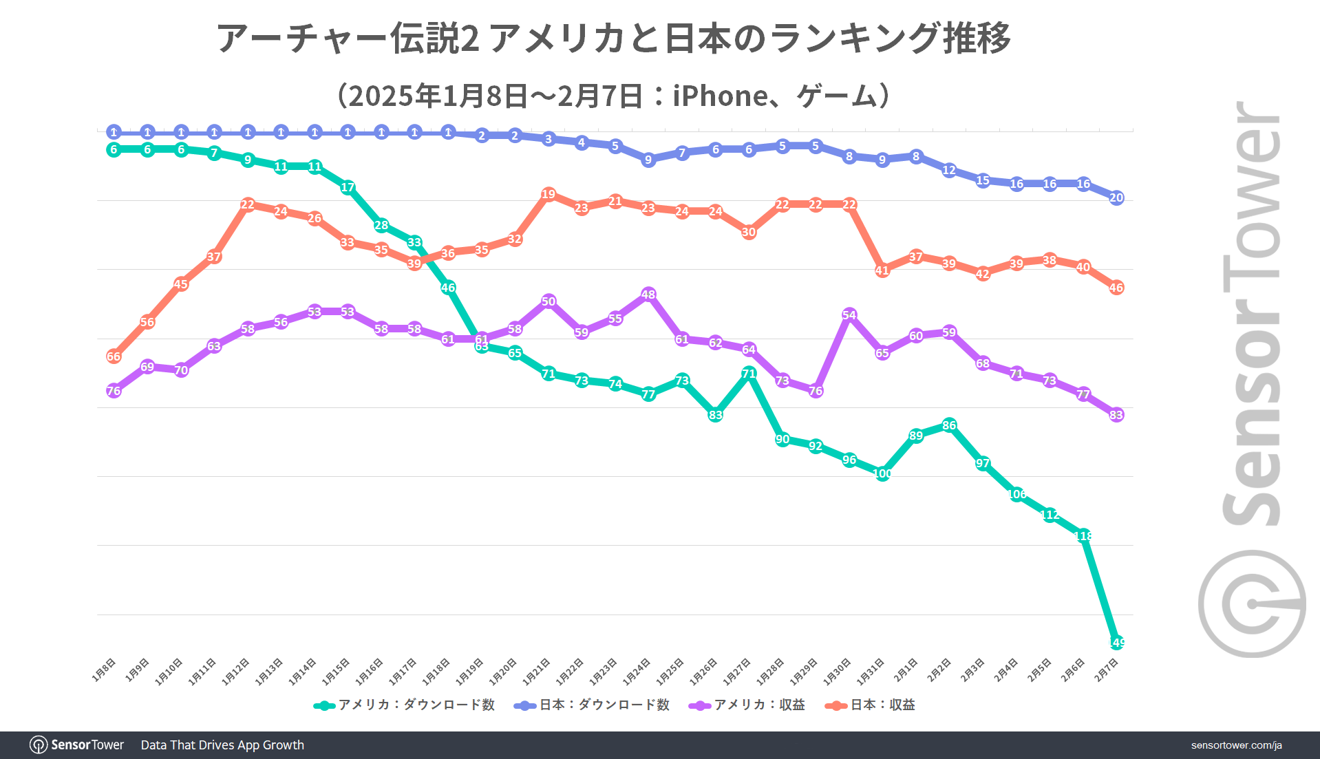 日本はいずれの指標でも2位ですが、ランキングではトップ市場のアメリカとは様相が異なります。Sensor Towerのデータによると、2025年1月8日から2月7日までの各市場のApp Store(ゲーム)におけるダウンロード数・収益ランキングを見ると、同期間のアメリカではダウンロード数ランキングの最高順位が6位ですが、日本はリリース日からトップでスタートを切っており、その後1月18日までトップを維持しています。