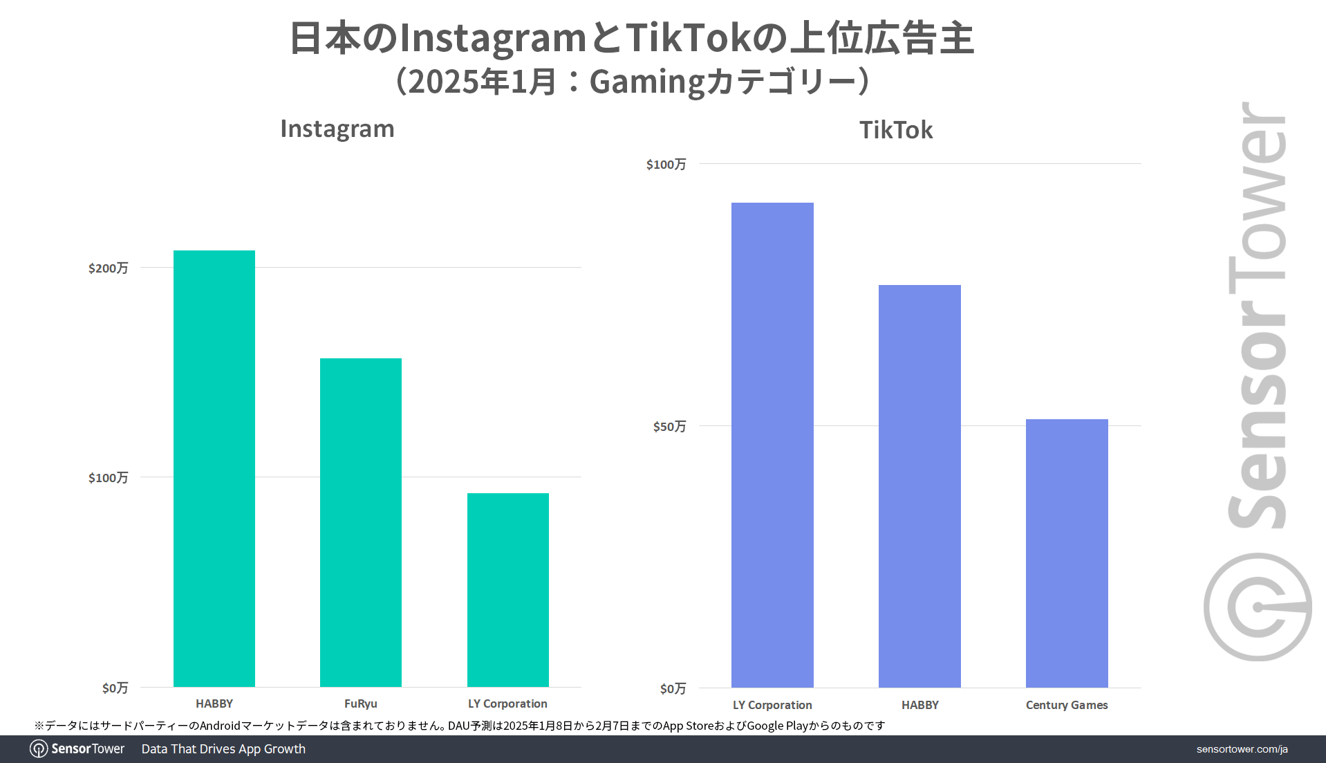 Pathmaticsのデータによると、2025年1月の日本のGamingカテゴリーにおいて、同作のパブリッシャーであるHABBYはInstagramでトップ、TikTokで2位の広告主となっています。