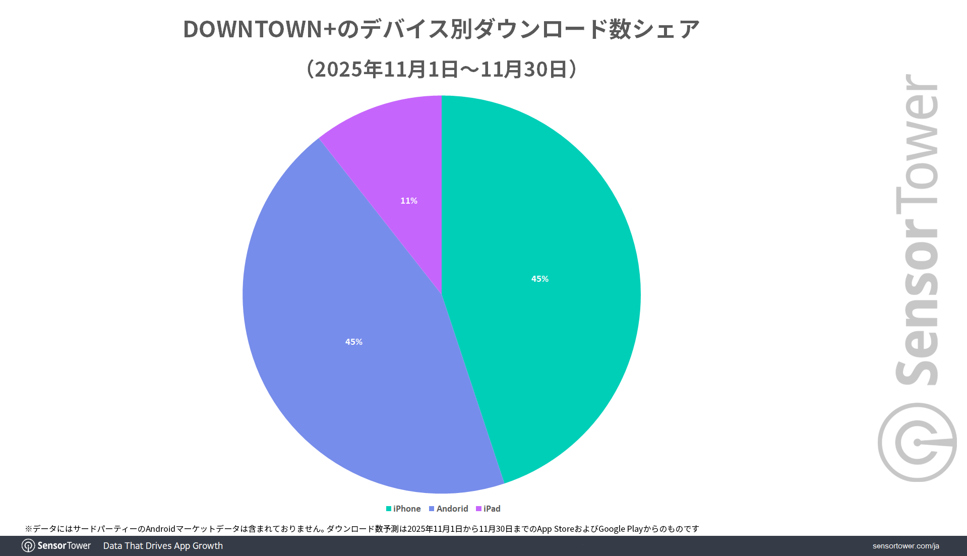 同期間の『DOWNTOWN+』のデバイス別ダウンロード数シェアを見ると、iPhoneとAndroidがそれぞれ45%、iPadが10%となっています。