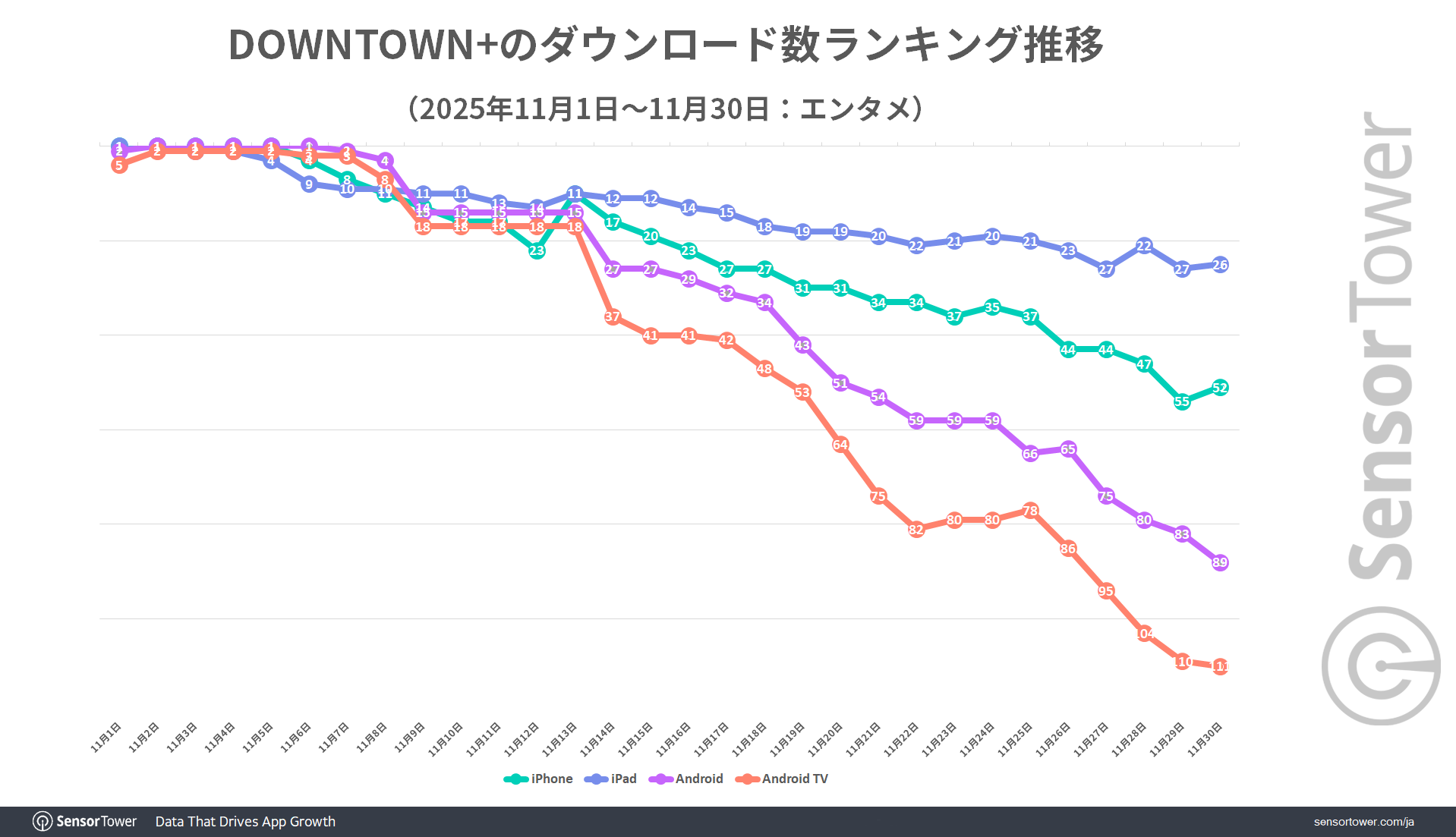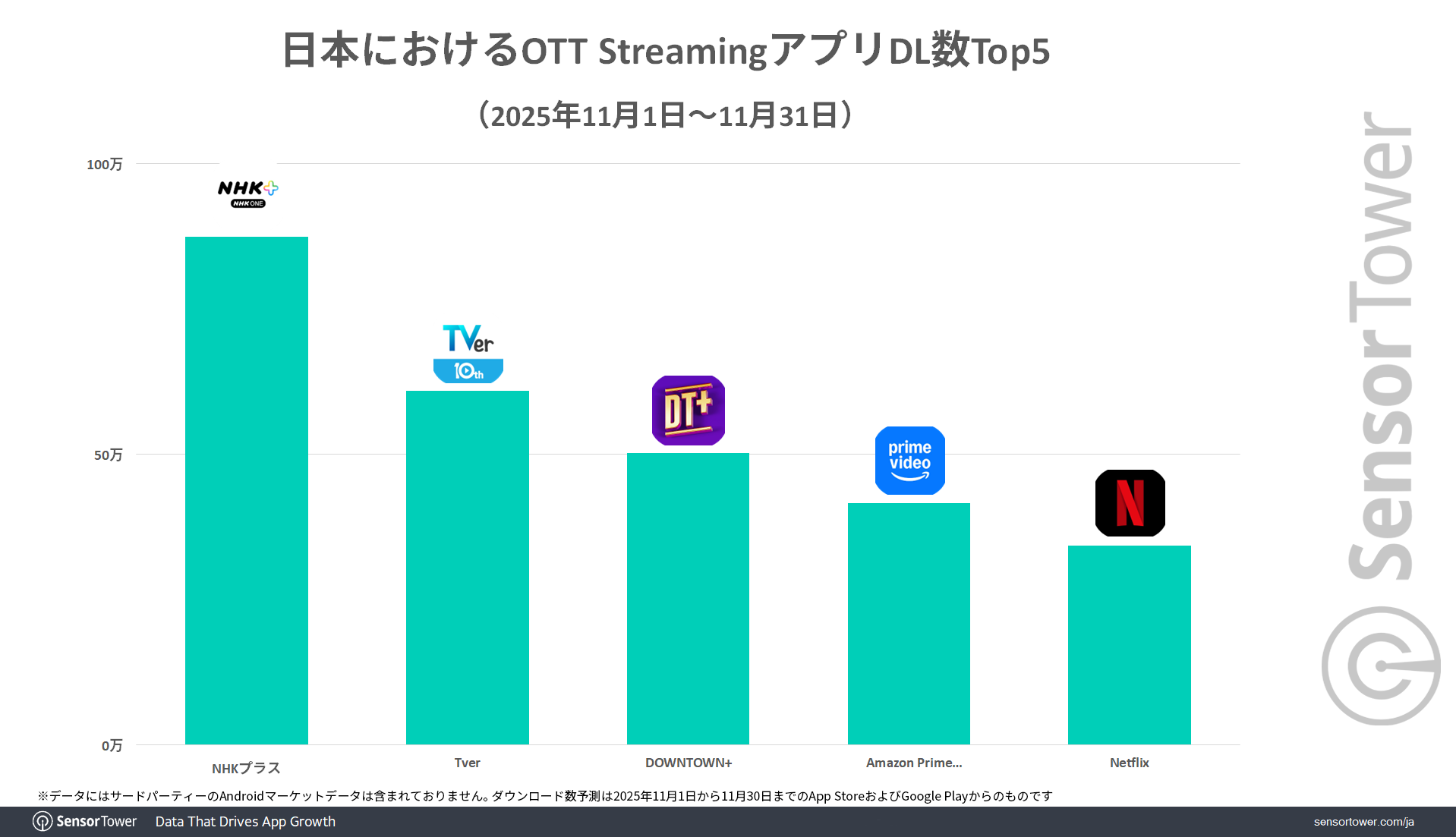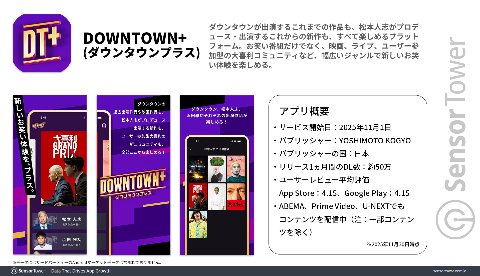 Sensor Towerのデータによると、サービス開始初月(2025年11月1日から11月30日)の『DOWNTOWN+』のダウンロード数は、約50万を記録しました。同期間の日本におけるOTT Streamingアプリのダウンロード数ランキングでは、『NHKプラス』(NHK)、『Tver』に次ぐ3位のポジションとなりました。