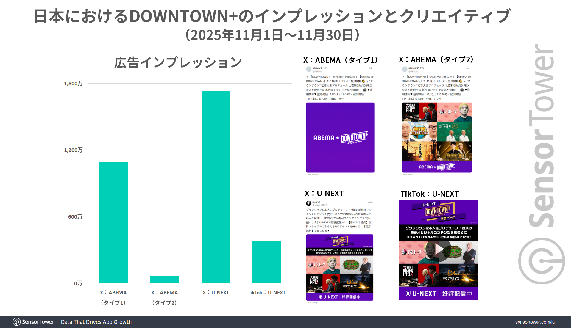 ABEMA(タイプ1)の広告インプレッションは、同社の2025年11月のXにおける広告ではインプレッショントップになっています。また、U-NEXTでは、XとTikToKを合わせた広告インプレッションが2,000万以上となるなど、『DOWNTOWN+』の注目度の高さがデータからわかります。