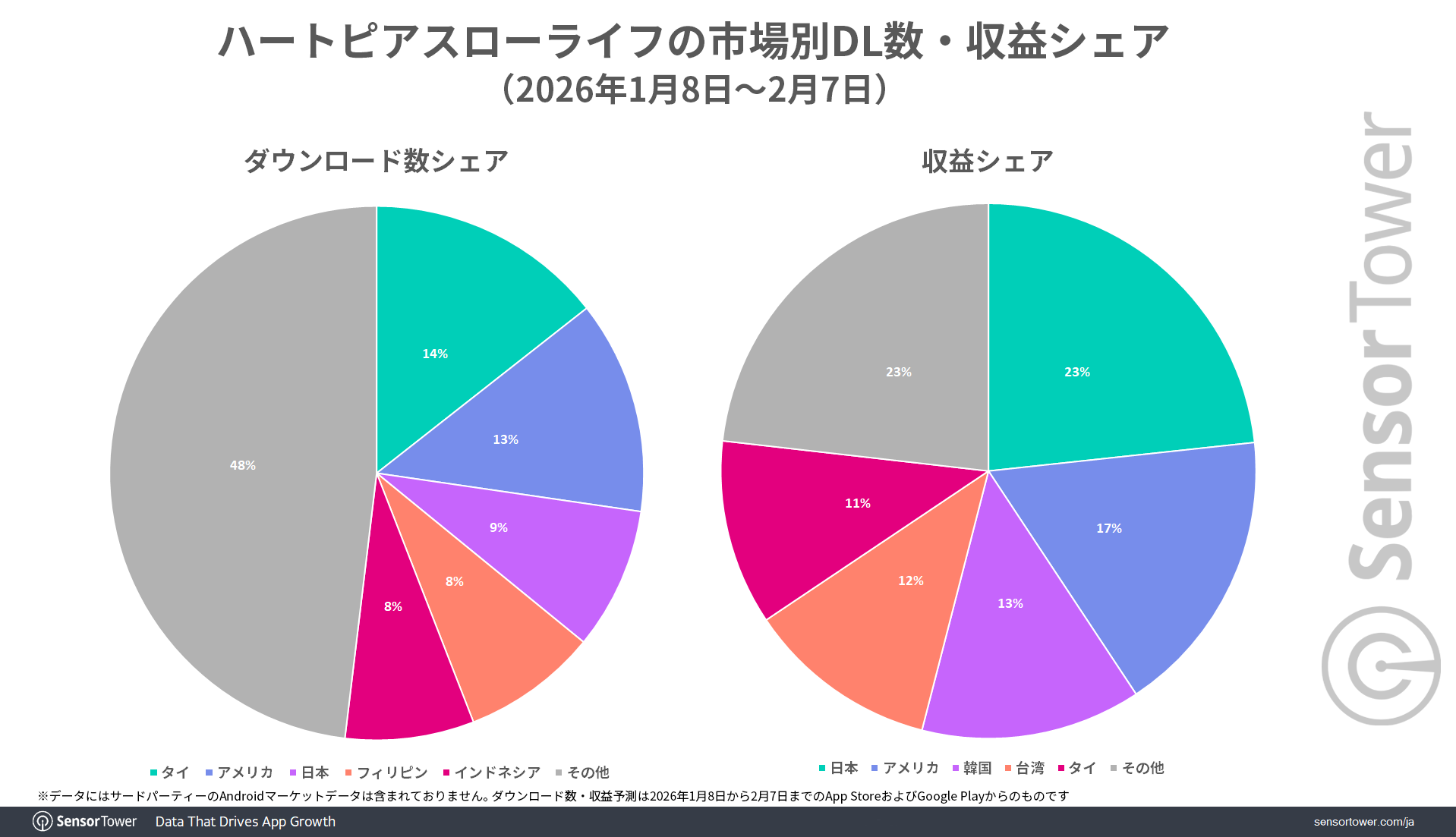 Sensor Towerのデータによると、『ハートピアスローライフ』の初月(2026年1月8日から2月7日)における市場別ダウンロード数では、タイが14%を占めてトップ市場となっています。