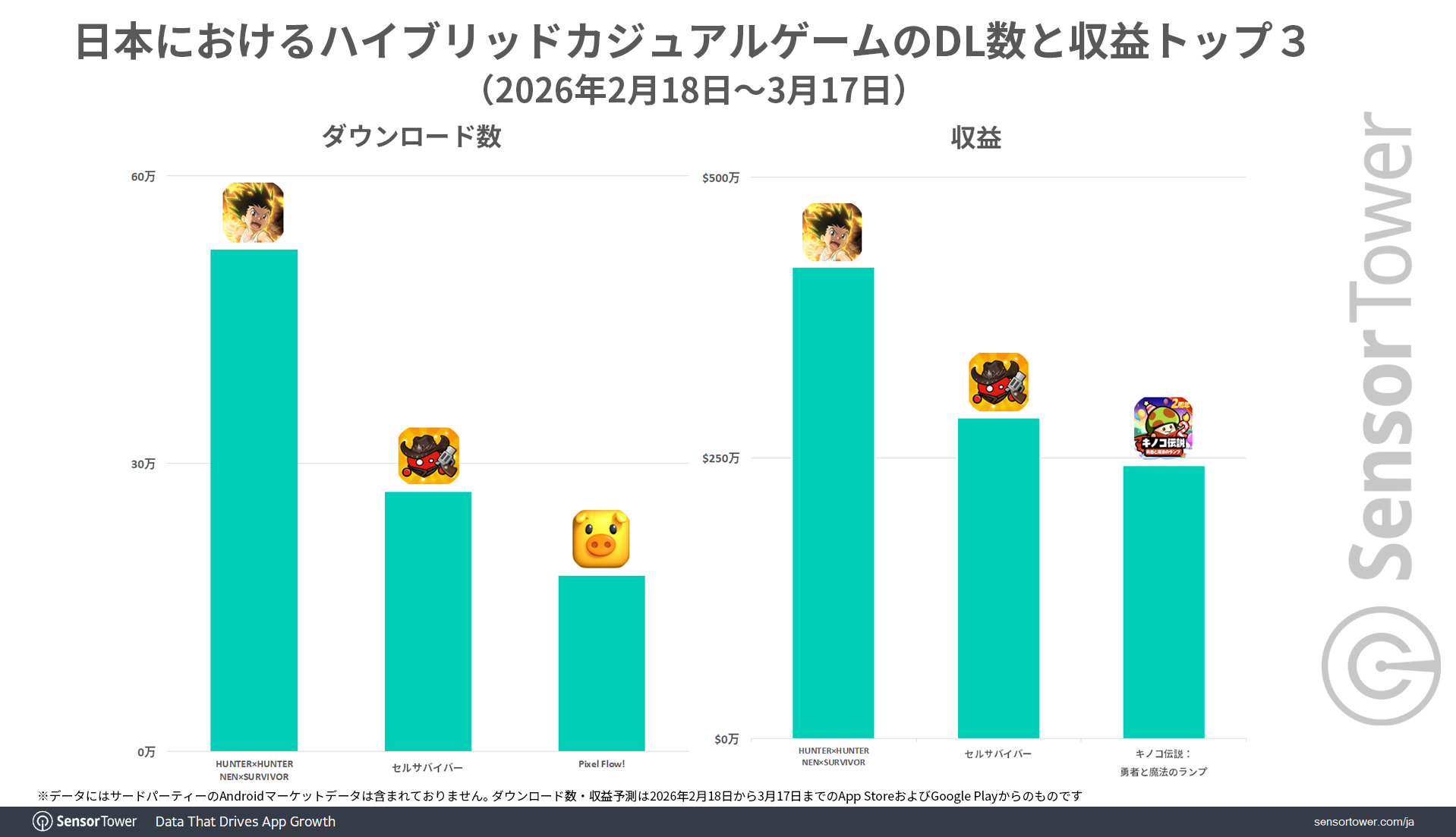 Sensor Towerで集計された収益に関するデータは、App StoreおよびGoogle Playにおける収益のIAP推定値であり、広告収入、サードパーティのAndroidマーケットにおける収益およびパブリッシャー公式サイトなどの決済システムにおける直接収入は含まれていません。特に純利益とのことわりがない限り、データはいずれも収益総額(プラットフォームシェアリング部分の控除前)を示しています。 また、ダウンロード数データにはサードパーティのAndroidマーケットデータは含まれておらず、App StoreもしくはGoogle Playアカウントの初回ダウンロードのみ集計しています。同じアカウントが他のデバイス、もしくは同じデバイスで行った重複ダウンロードは集計に含まれていません。ダウンロード数データは同じアプリの異なるバージョンもまとめて集計しています(例:FacebookとFacebook Lite)。なお、Google Playは中国本土では利用できません。