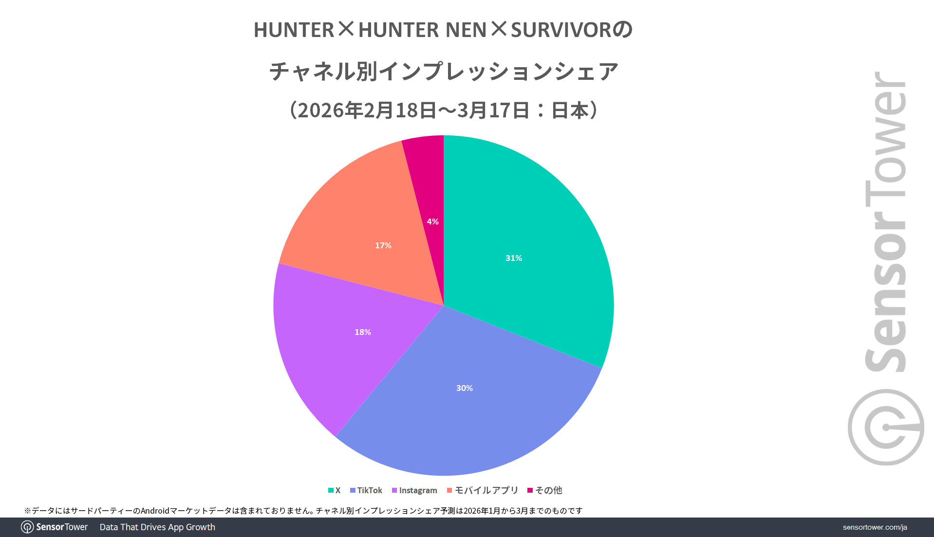 新作『HUNTER×HUNTER NEN×SURVIVOR』のリリースに合わせて、どういった広告展開がされたのでしょうか。Pathmaticsのデータによると、2026年2月18日から3月17日までの日本における同作のチャネル別広告インプレッションシェアでは、XとTikTokが約30%を占めてメインチャネルとなっており、この2つのインプレッションは6,500万以上となっています。