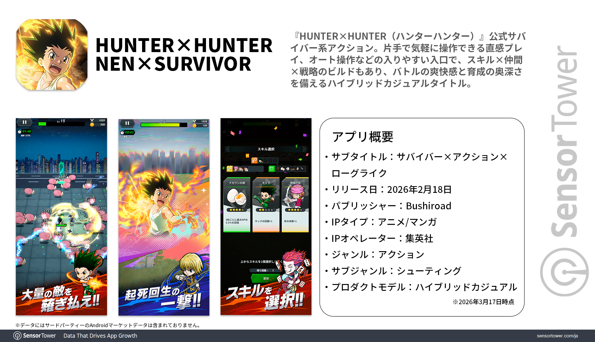 2026年2月18日に世界同時リリースされた『HUNTER×HUNTER NEN×SURVIVOR』(Bushiroad)。本作は大人気のマンガ「HUNTER×HUNTER」のIPを活用した公式モバイルシューティングゲームで、押し寄せる敵を“念能力”で薙ぎ払うローグライク体験と、ランダムに手に入るスキルと仲間のシナジーで、毎回異なる最強ビルドの構築を楽しむことができます。