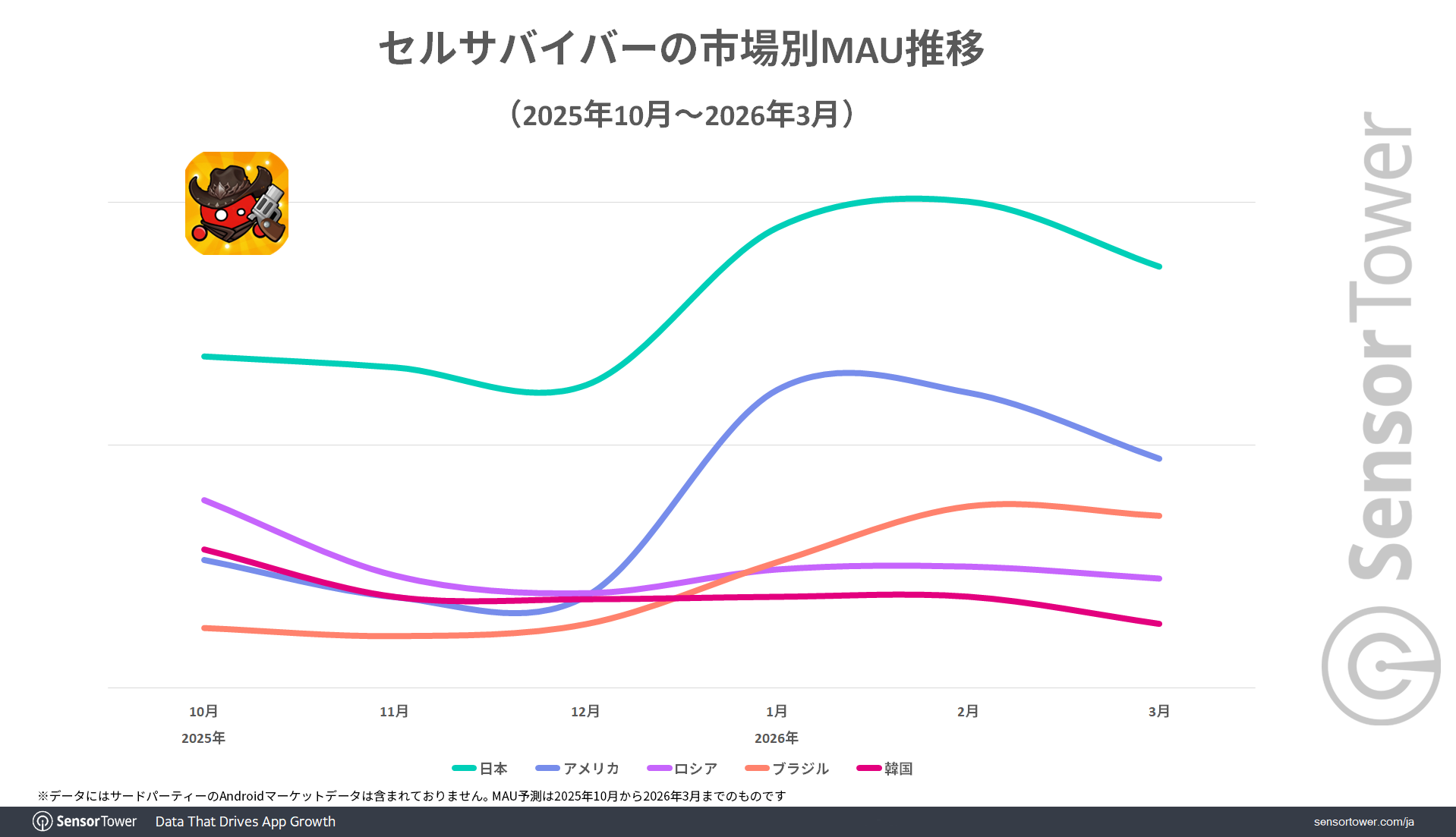 同作の日本での人気は、MAUでも確認できます。Sensor Towerのデータによると、2025年10月から2026年3月までの月別MAUを見ると、日本はアメリカを大きく上回ってすべての月でトップを維持しています。