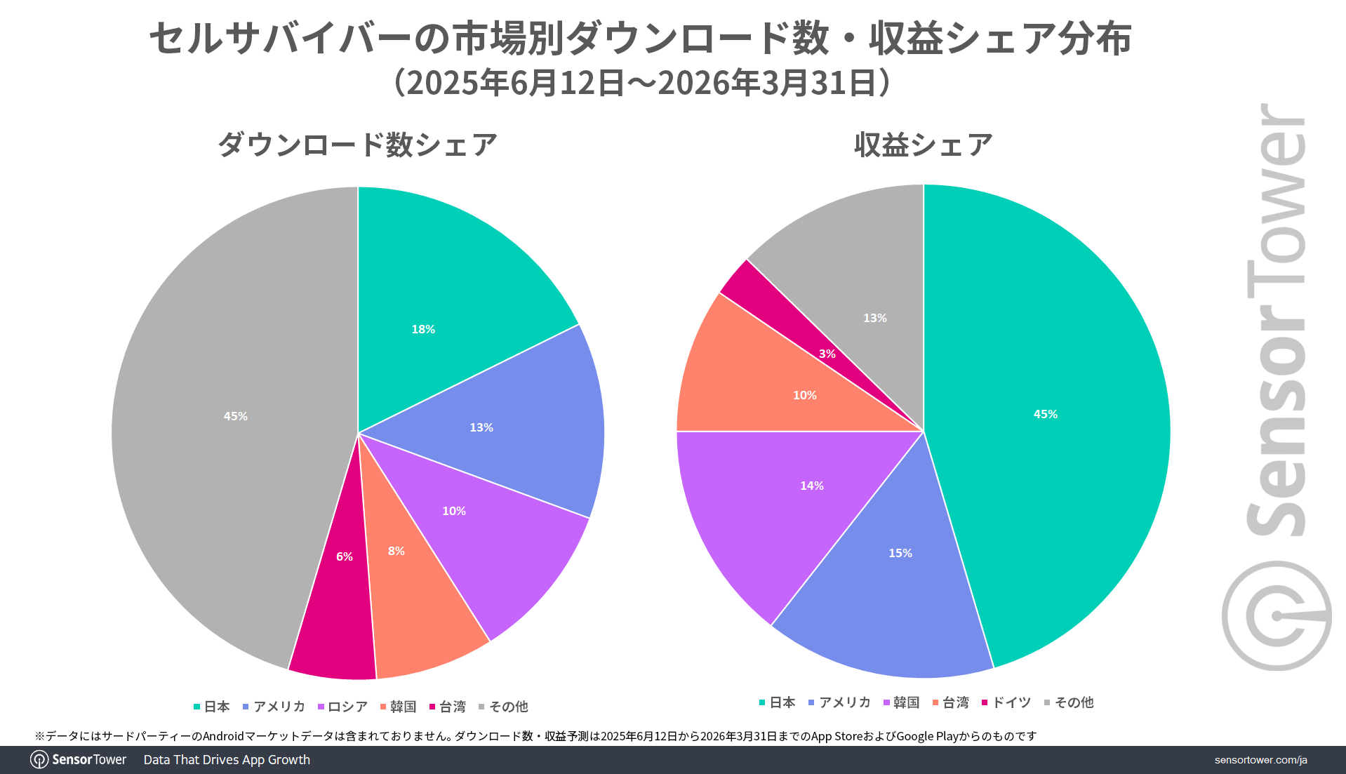 この『セルサバイバー』は日本において際立ったパフォーマンスがデータから確認できます。Sensor Towerのデータによると、2025年6月12日~2026年3月31日までの市場別ダウンロード数シェアで、日本はアメリカを超えてトップとなっており、約18%のシェアを占めています。