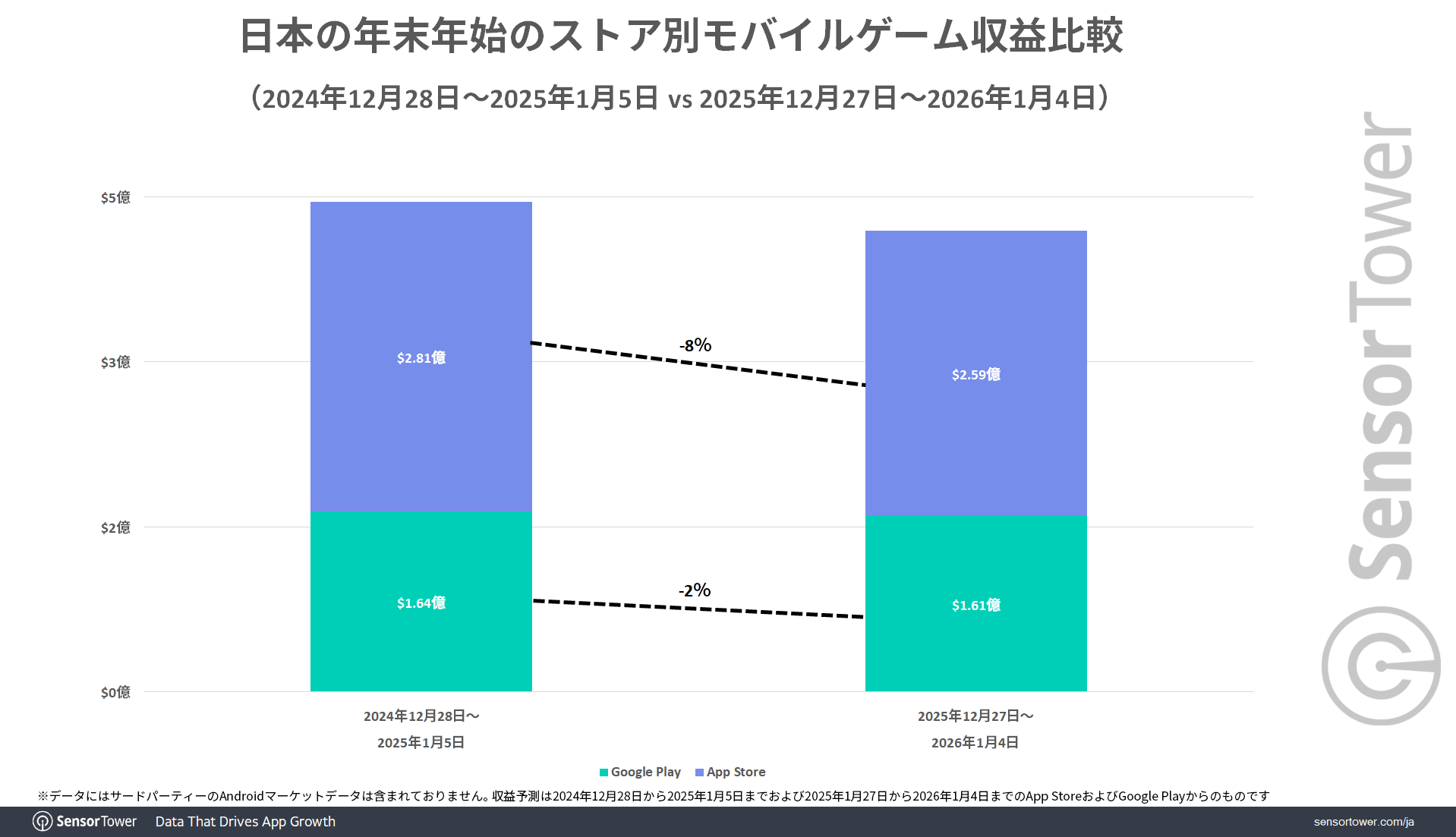 Sensor Towerのデータによると、2025年12月27日から2026年1月4日までの日本におけるモバイルゲーム収益は4.2億ドルを記録し、前年比で約10%の減少となりました。同期間の収益をストア別に見ると、App Storeで2.6億ドル、Google Playで1.6億ドルとなっています。