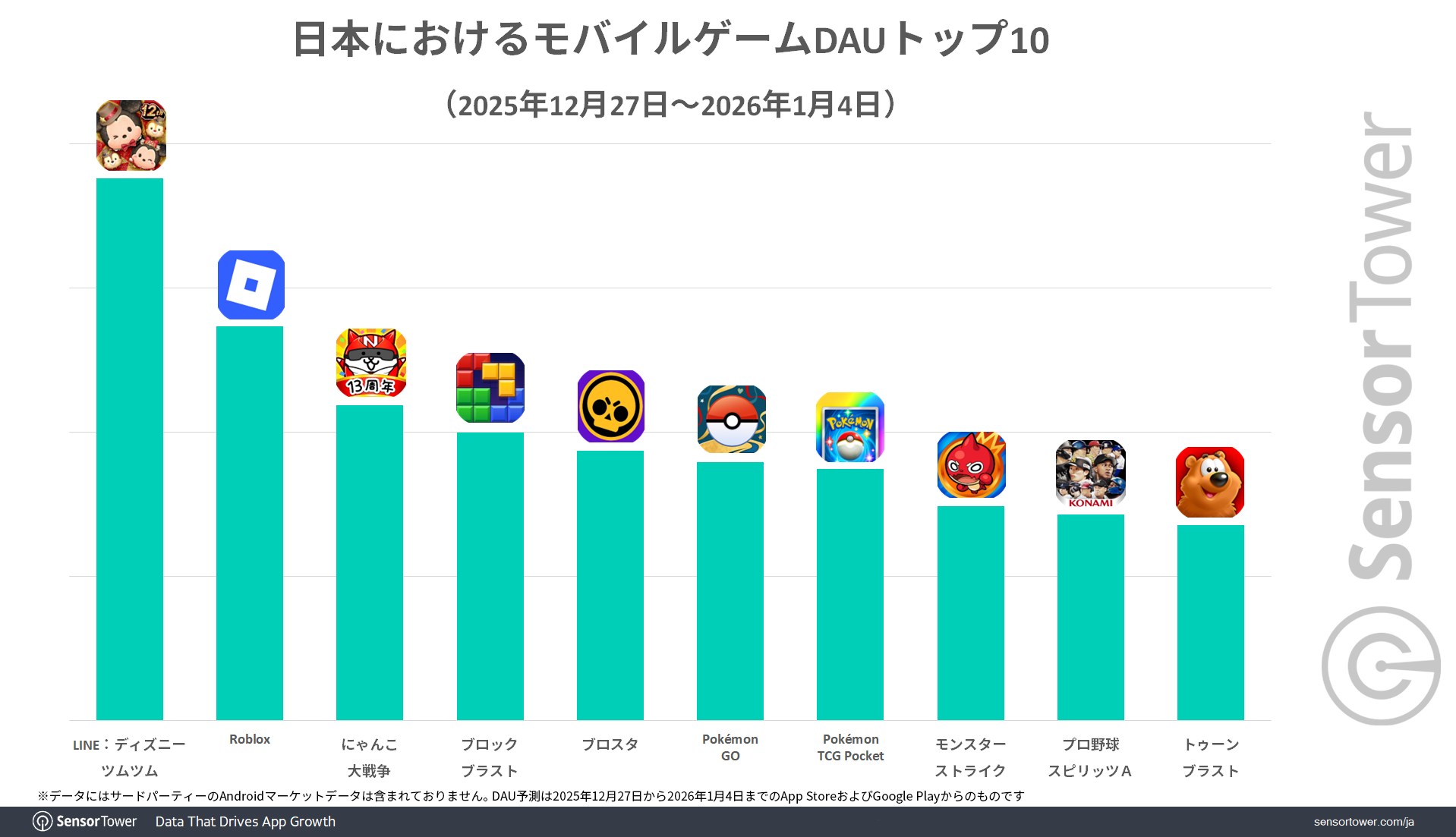 DAUの指標では、『LINE:ディズニー ツムツム』(LY Corporation)が際立っています。Sensor Towerのデータによると、2025年12月27日から2026年1月4日までの日本におけるモバイルゲームDAUランキングで、『LINE:ディズニー ツムツム』がトップを記録しました。