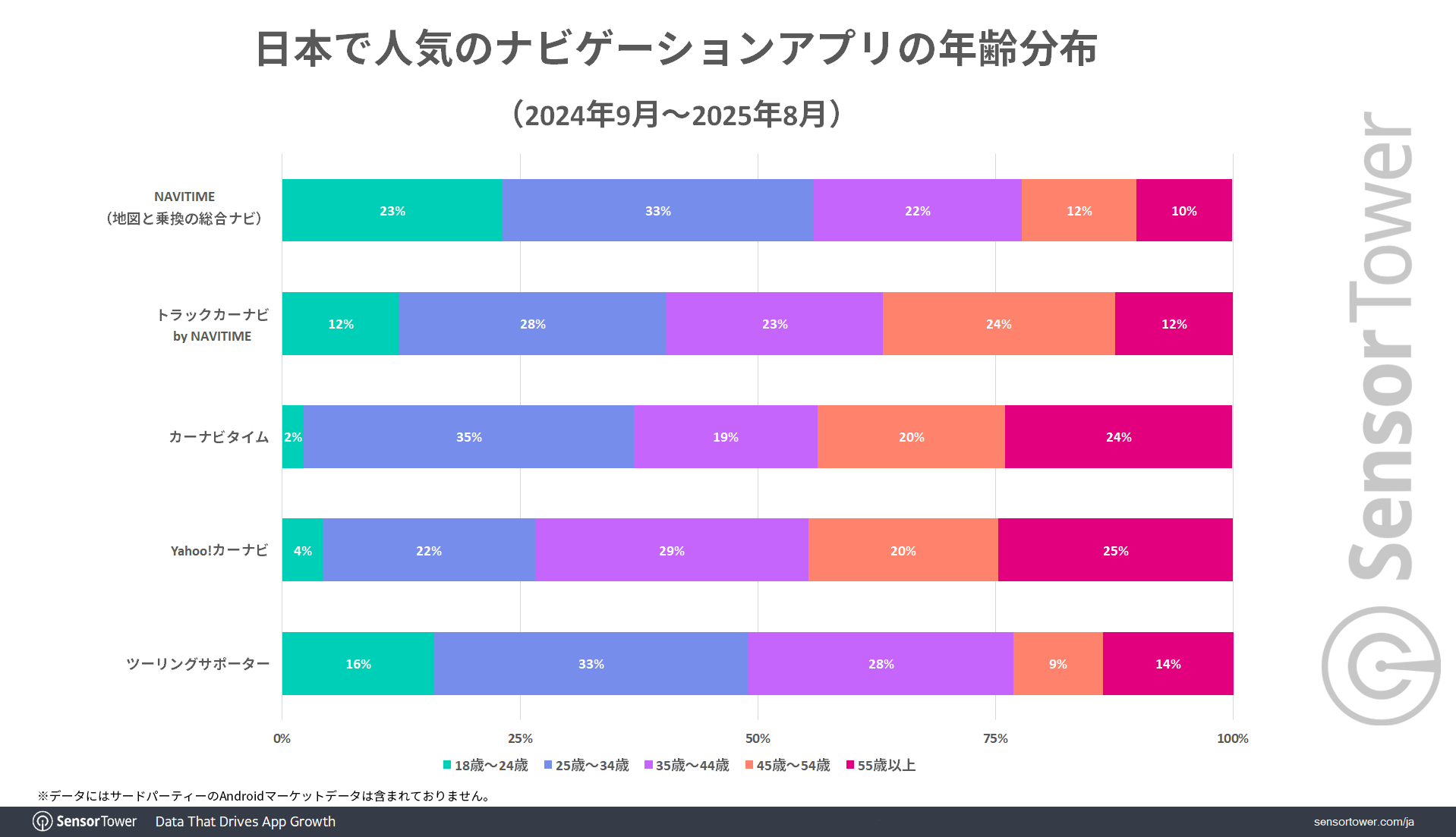 Audience Insightsのデータによると、2024年9月から2025年8月までの日本における人気ナビゲーションアプリの年齢層では、45歳から55歳以上の層の高さがわかります。