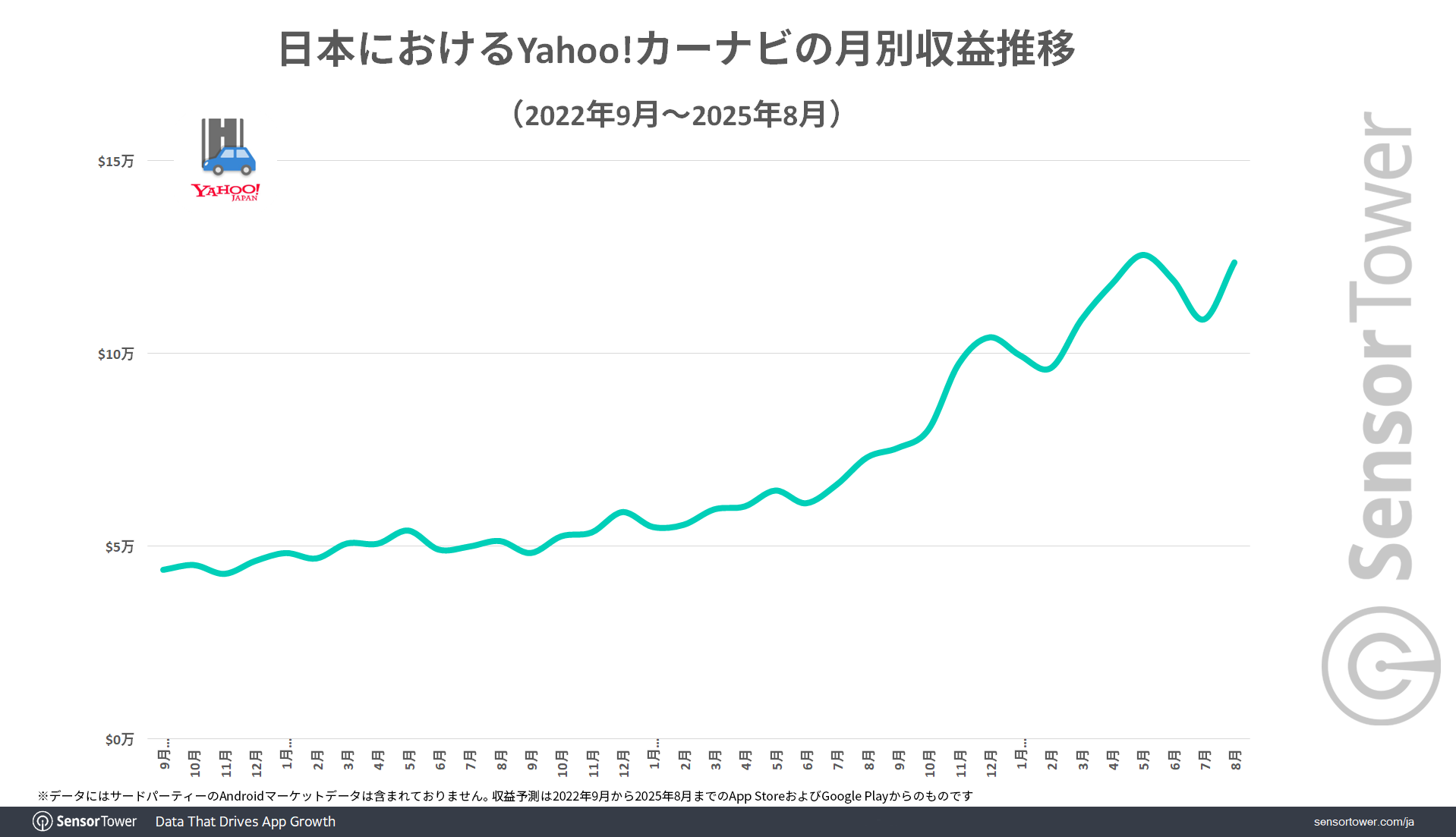 Sensor Towerのデータによると、2022年9月から2025年8月までの日本における『Yahoo!カーナビ』の月別収益推移を見ると、「推しドラ」導入以降の2024年10月から収益が向上していることが確認でき、その後も上昇気流に乗っています。同機能提供前と後の平均月間収益を比較すると2倍近くに成長しています。