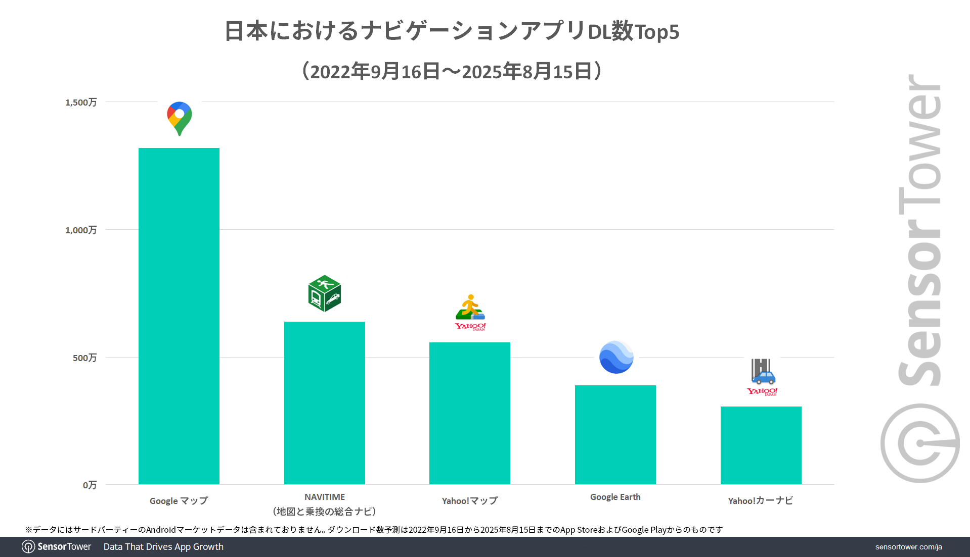 Sensor Towerのデータによると、日本における直近3年間のナビゲーションアプリ(カテゴリ:ナビゲーション、App IQ:Navigation & Maps)のダウンロード数では、『Google マップ』(Google)が1,300万以上を記録してトップとなっています。2位の『NAVITIME』(NAVITIME JAPAN)に2倍以上の差をつけており、ダウンロード数では際立った存在です。