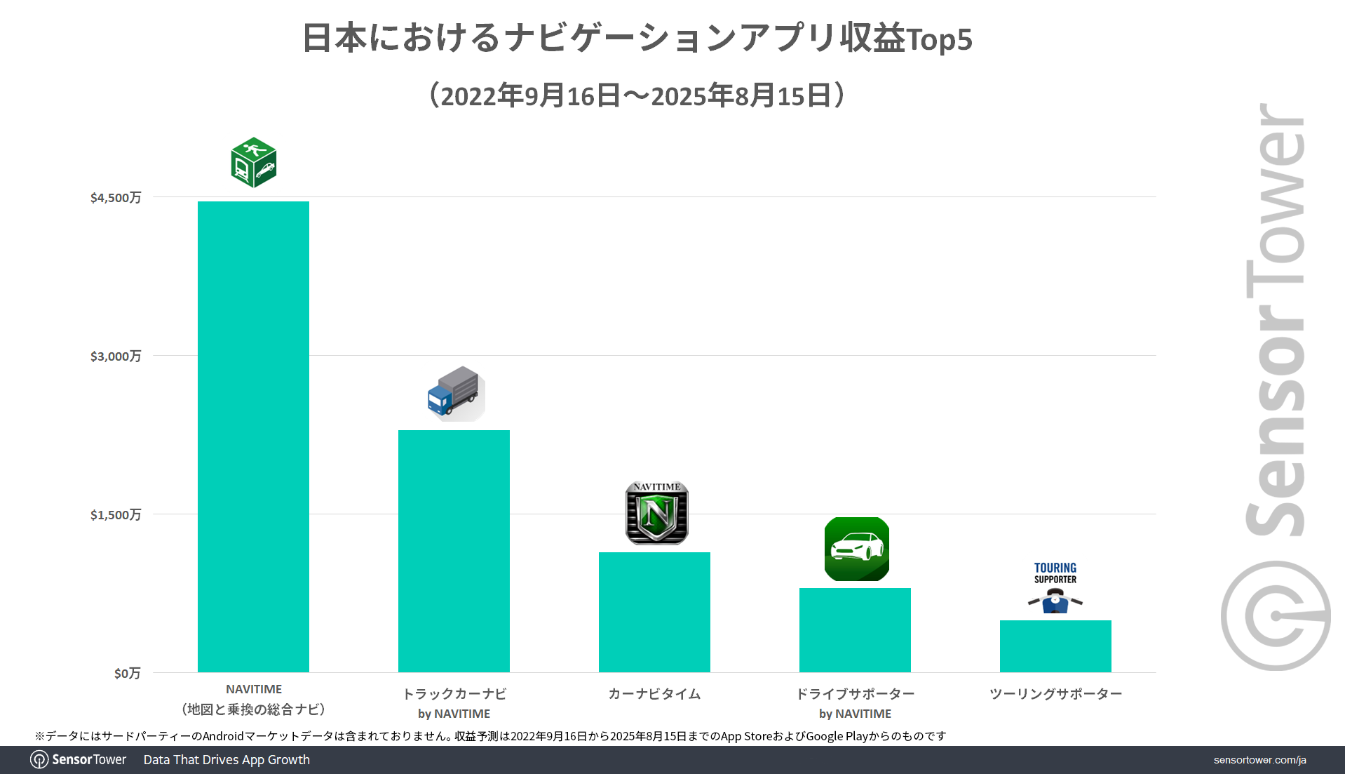収益成長量では、NAVITIMEのアプリが優勢の中、『Yahoo!カーナビ』(Yahoo Japan)が健闘しています。Sensor Towerのデータによると、日本における直近3年間のナビゲーションアプリの収益成長量で、『Yahoo!カーナビ』が4位にランクインしています。