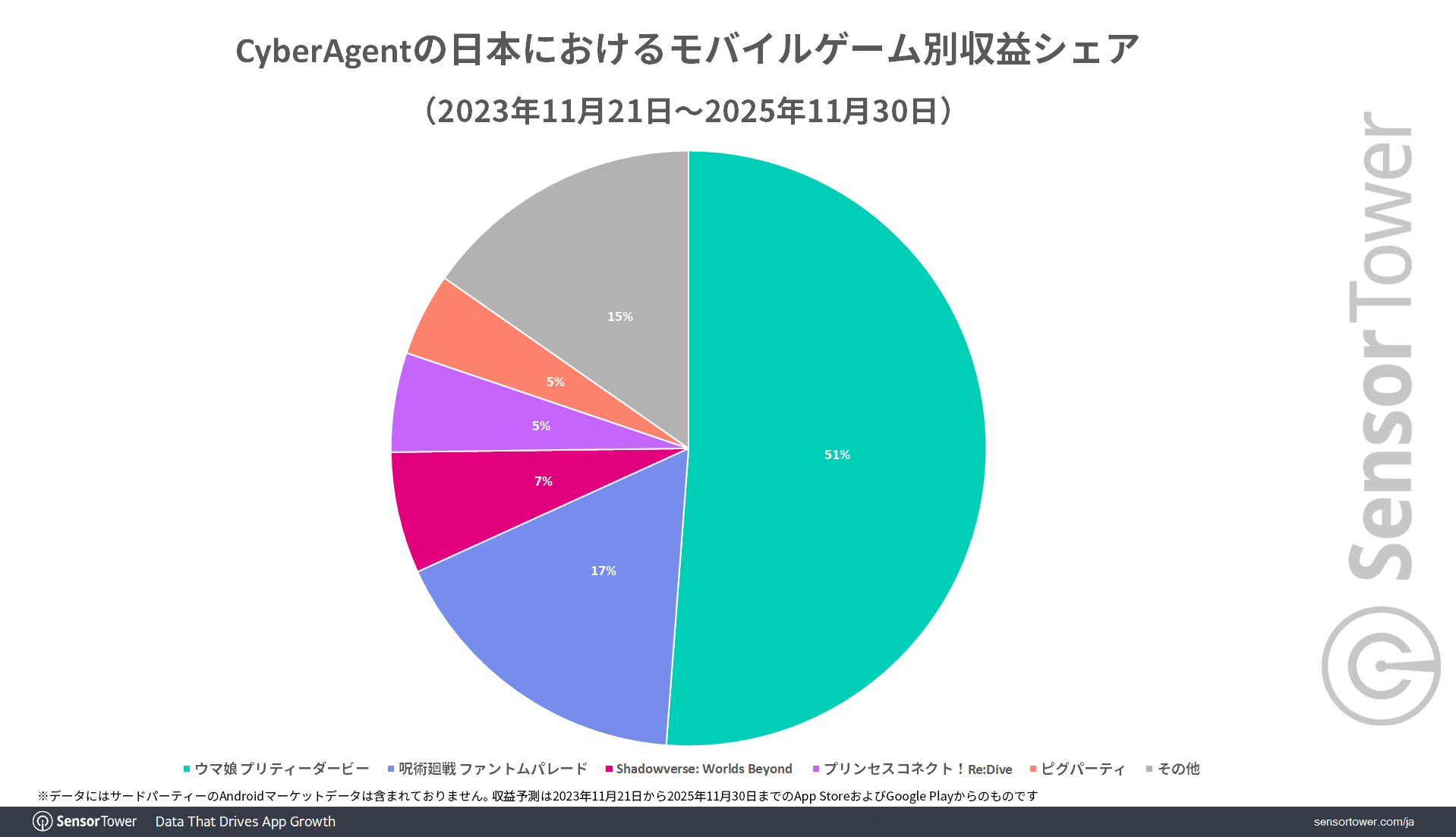 『ウマ娘 プリティーダービー』のCygamesを始め、複数の子会社を持つCyberAgent(サイバーエージェント)。『呪術廻戦ファントムパレード』のSumzapも同社のグループ会社の一つです。Sensor Towerのデータによると、2023年11月21日から2025年11月30日までの日本におけるCyberAgentのモバイルゲーム別収益シェアでは、『ウマ娘 プリティーダービー』が約50%を占めてトップとなっています。