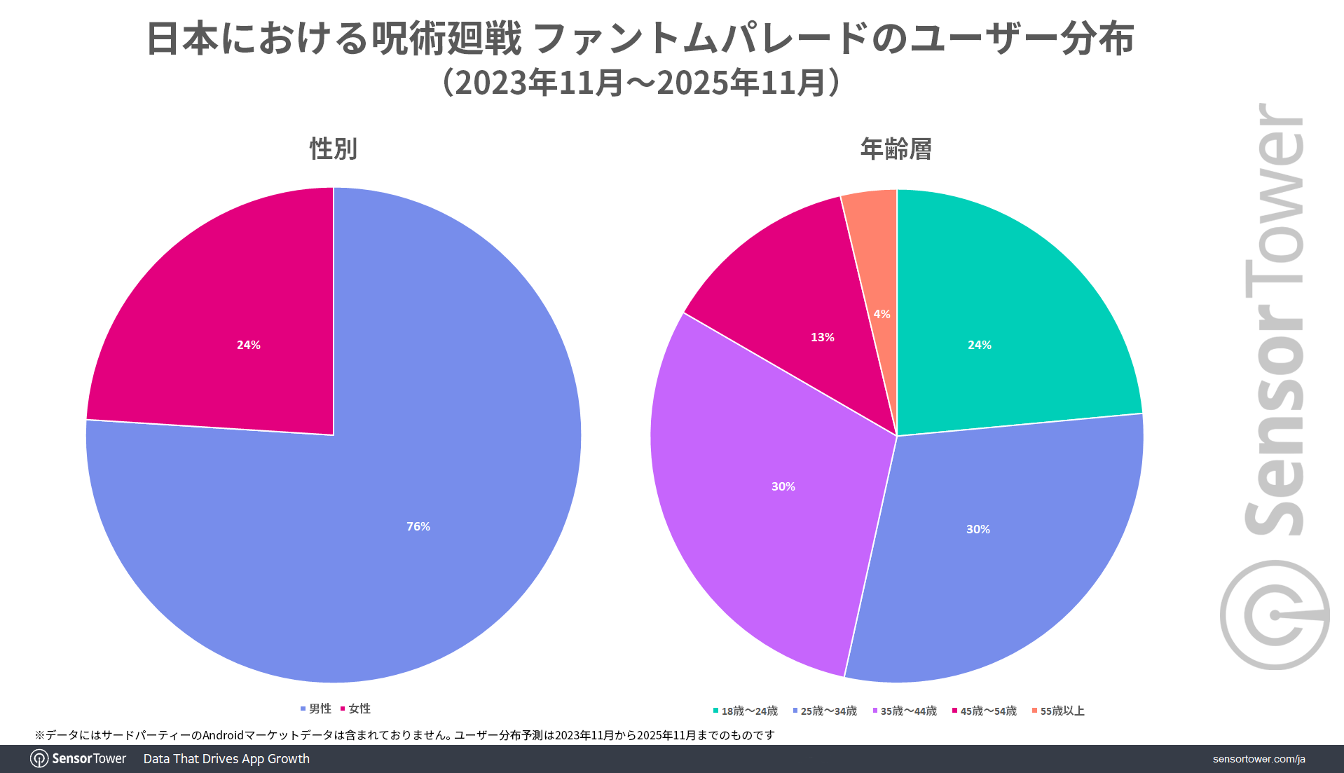 こうした人気を支えているのはどういったユーザー層でしょうか。Audience Insightsのデータによると、2023年11月から2025年11月までの日本における『呪術廻戦ファントムパレード』のユーザー分布では、男性が約75%を占めています。