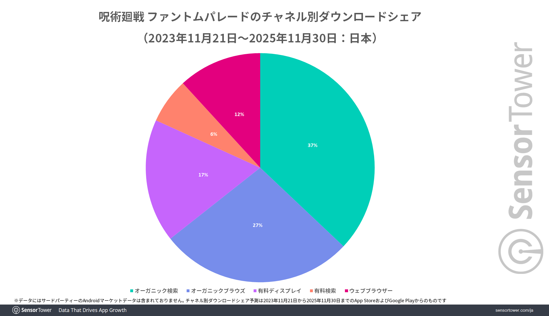 ダウンロードにつながっているチャネルはどうなっているでしょうか。Sensor Towerのデータによると、2023年11月21日から2025年11月30までの日本における『呪術廻戦 ファントムパレード』のチャネル別ダウンロードシェアは、オーガニックによるものが上位を占めています。
