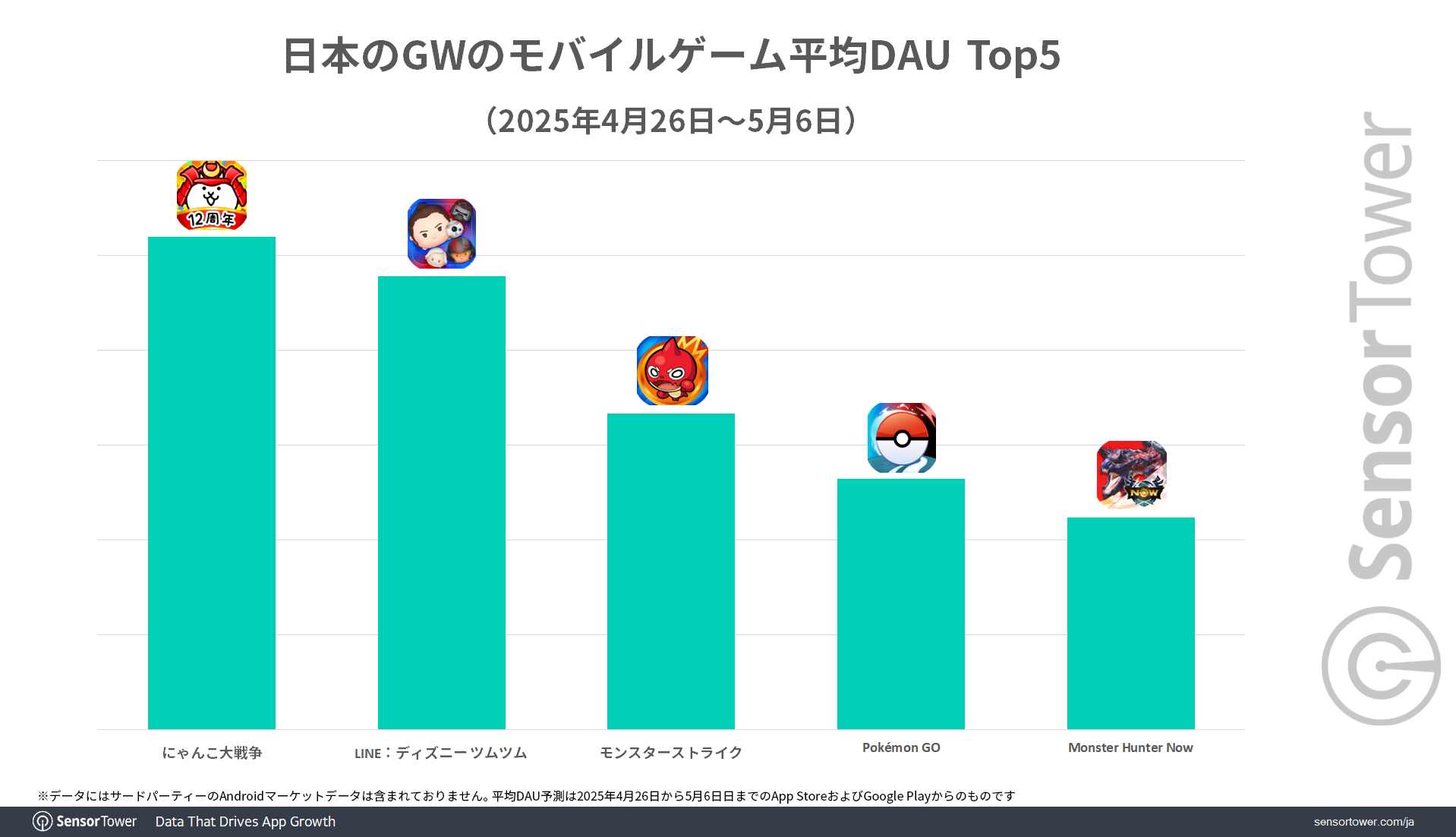 2025年ゴールデンウィーク中のモバイルゲーム平均DAUでは、『にゃんこ大戦争』(PONOS)がトップとなりました。Sensor Towerのデータによると、2025年4月26日から5月6日までの日本における平均DAUでは、『にゃんこ大戦争』『LINE:ディズニー ツムツム』(LY Corporation)、『モンスターストライク』(MIXI)の日本パブリッシャーのモバイルゲームがトップ3となりました。