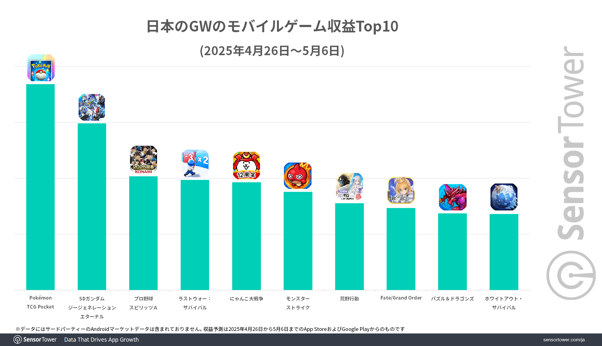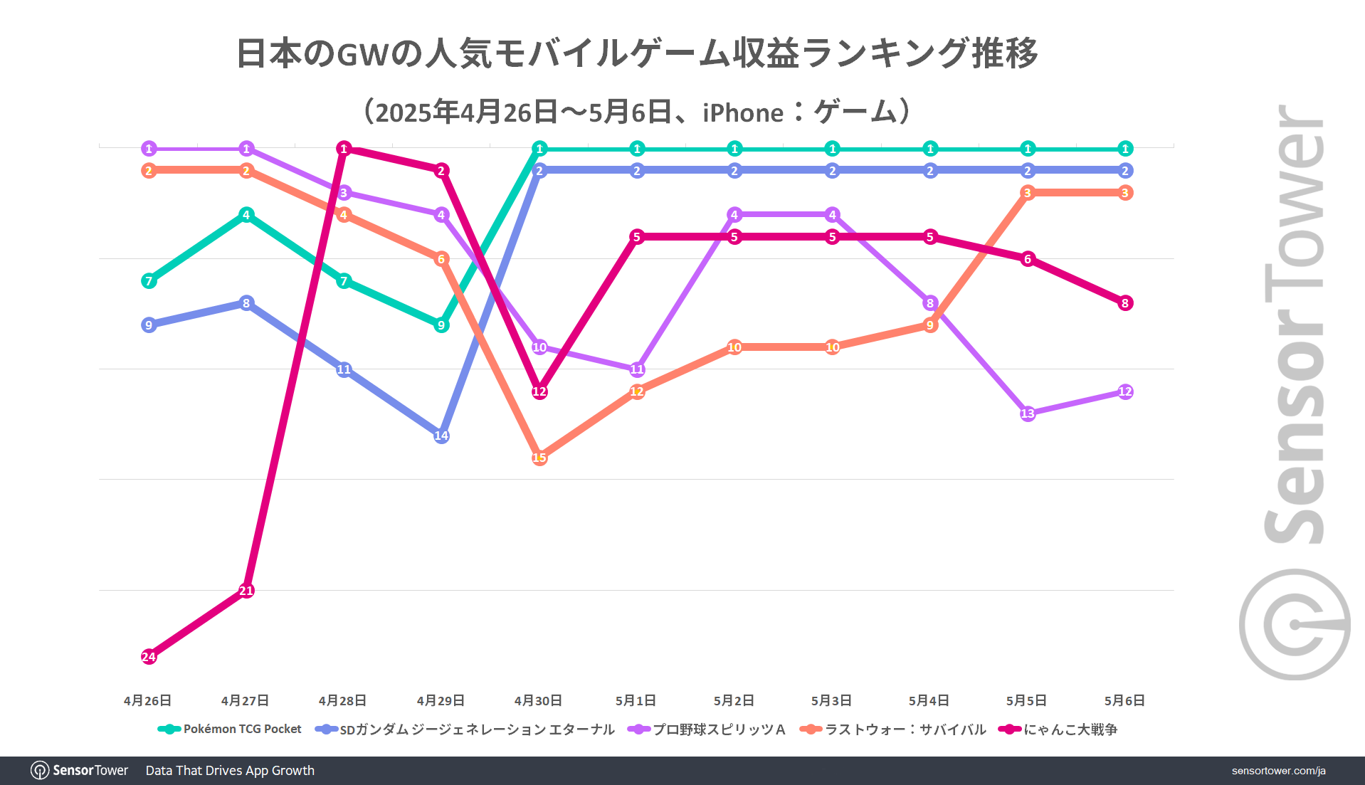 一方、収益では『Pokémon TCG Pocket』(The Pokemon Company)の強さがわかります。Sensor Towerのデータによると、2025年4月26日から5月6日までの日本におけるモバイルゲーム収益で、同作が1,500万ドル以上を記録してトップとなりました。