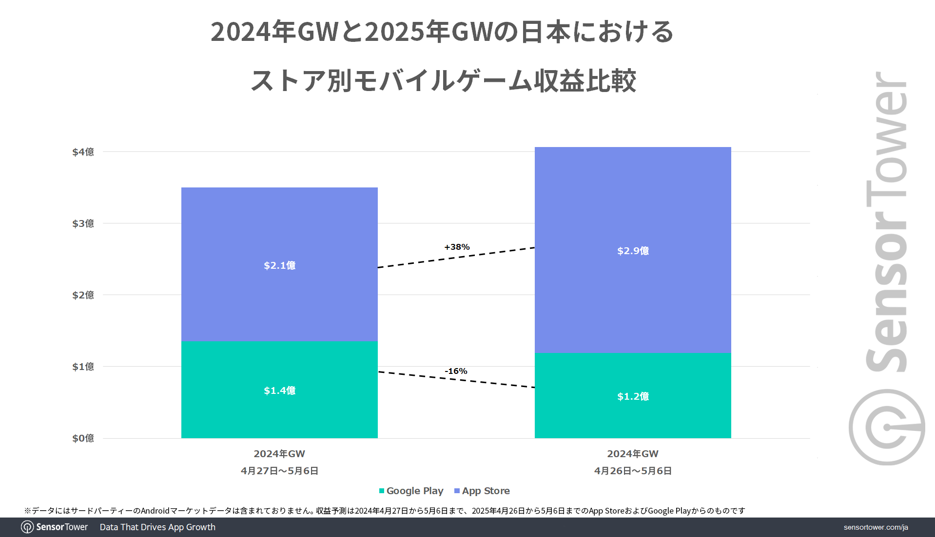最大11連休となった2025年のゴールデンウィーク。行楽地への移動時やご自宅でゆっくりとモバイルゲームを楽しんだ方もいらっしゃると思います。Sensor Towerのデータによると、2025年4月26日から5月6日までの日本におけるモバイルゲーム収益は4.1億ドルを記録し、昨年比で+17%を記録しました。