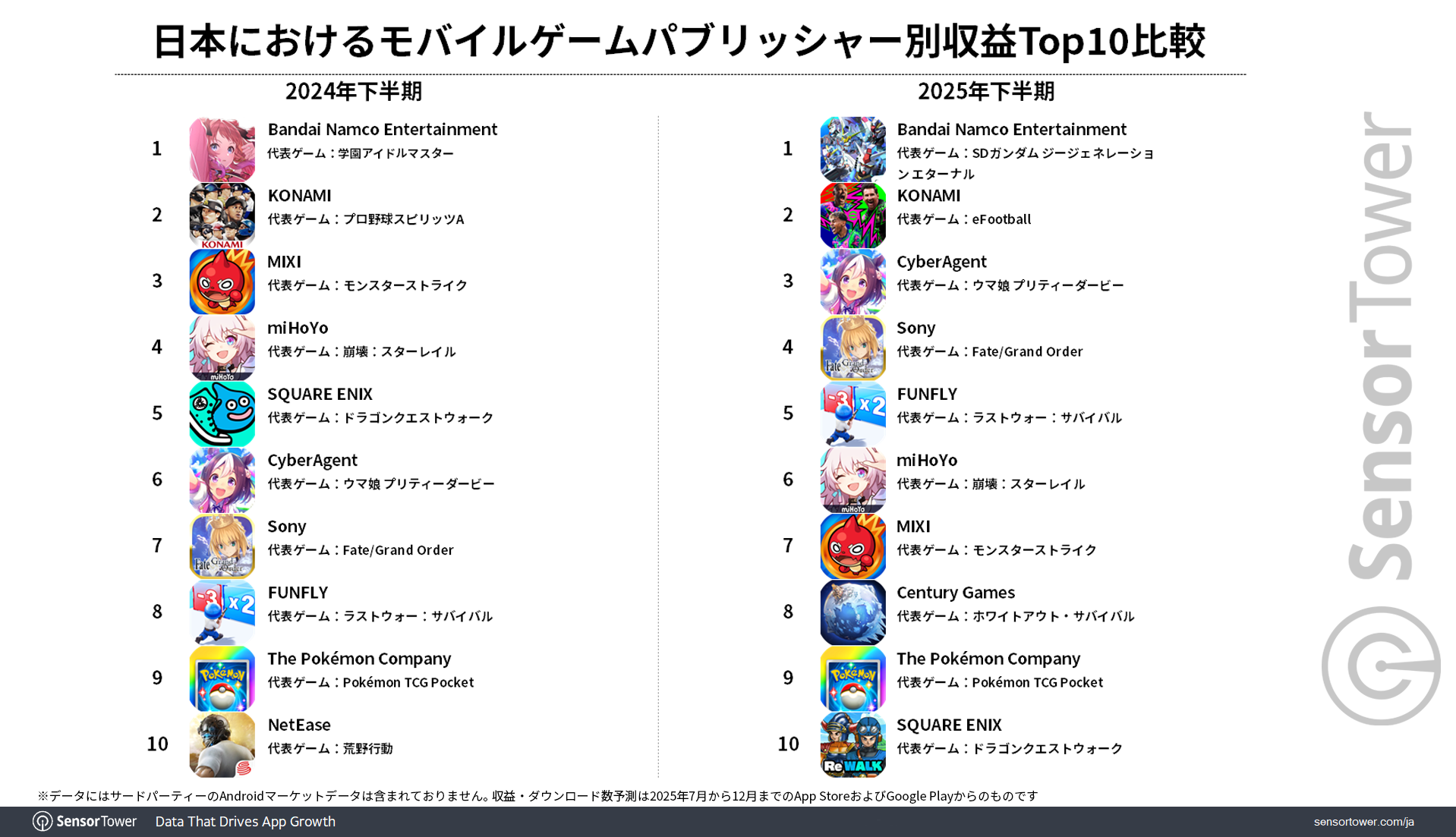 Sensor Towerのデータによると、2025年下半期の日本におけるモバイルゲームパブリッシャー別収益ランキングで、Bandai Namco Entertainmentがトップとなりました。今期の同社収益を牽引したのは『SDガンダム ジージェネレーション エターナル』で、約30%の収益シェアを占めています。