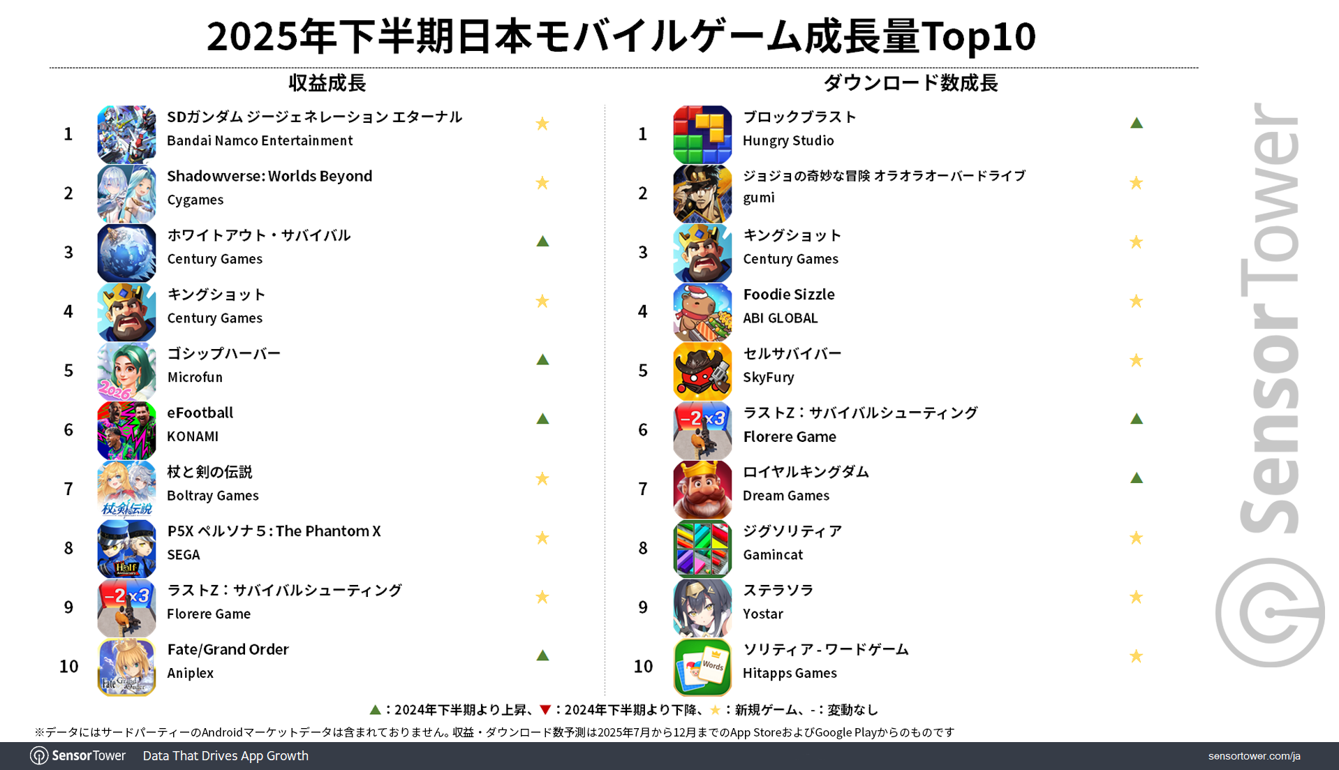 収益成長量で10位にランクインした『Fate/Grand Order』(Aniplex)は、2025年に10周年を迎え、2025年下半期に世界で2億ドル以上の収益を上げ、このうち約80%が日本市場からのものです。また、Century Gamesはトップ5内に『ホワイトアウト・サバイバル』と『キングショット』の2タイトルをランクインさせていることも注目に値します。