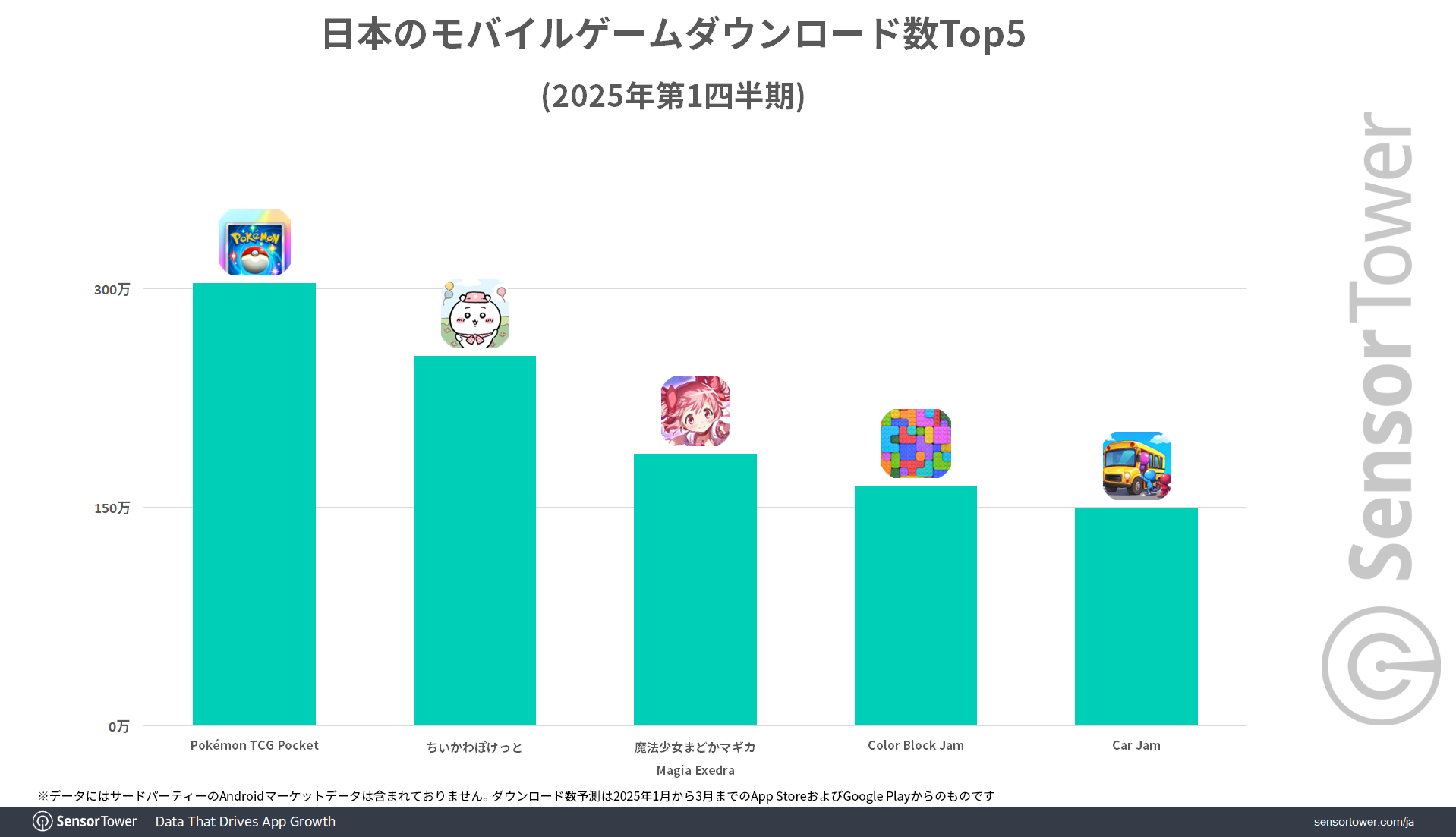 2025年も第1四半期が終了しましたが、日本のモバイル市場では2024年10月にリリースされたカードバトルゲーム『Pokémon TCG Pocket』(The Pokémon Company)がダウンロード数・収益の両指標でその存在感を示しています。Sensor Towerのデータによると、2025年1月から3月までの日本におけるモバイルゲームダウンロード数で、同作は300万以上のダウンロード数を記録してトップとなっています。