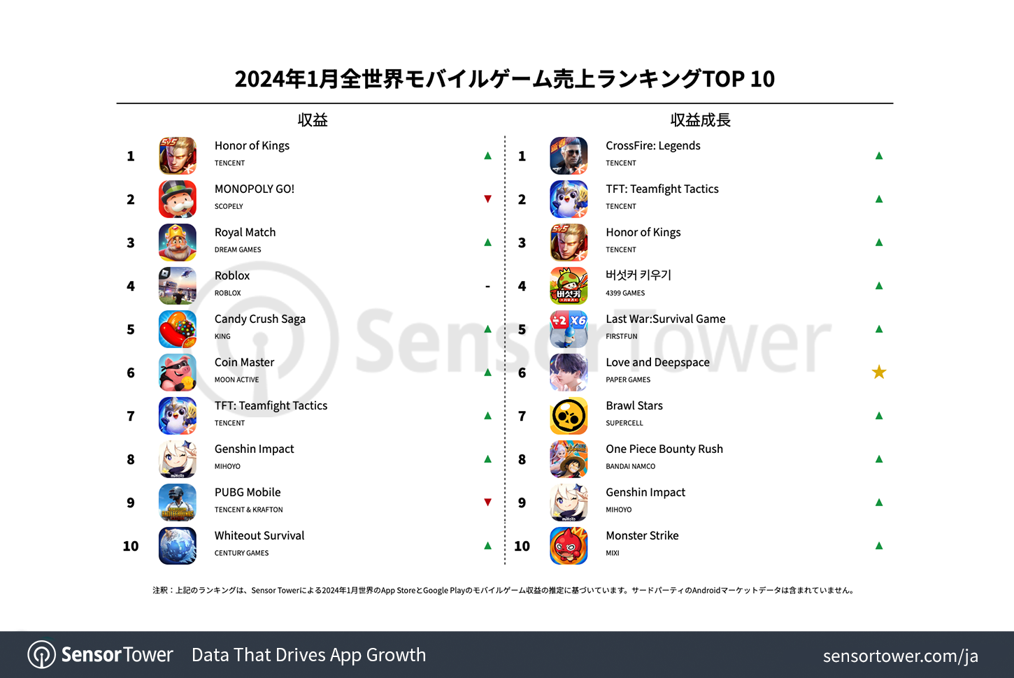Sensor Towerのストアインテリジェンスデータによると、Tencentの『Hornor of Kings』が2024年1月の全世界App StoreとGoogle Playで2億3,300万ドルの収益を記録し、世界のモバイルゲーム収益ランキングで首位に返り咲きました。新スキン、新シーズン、期間限定スキンなどの複数のイベントに支えられ、同ゲームは1月5日にその月の単日最高収益を記録しました。グローバル人気モバイルゲーム収益TOP 10の全体データは、上記のチャートをご参照ください。※上記のデータには、サードパーティのAndroidマーケットデータは含まれておりません。