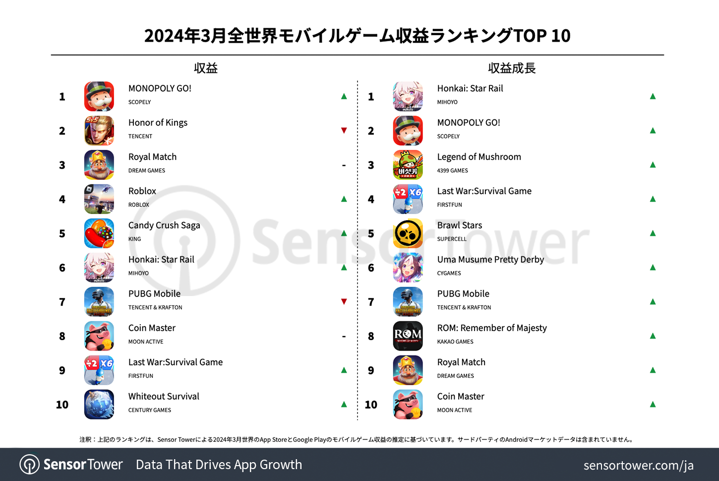 Sensor Towerのストアインテリジェンスデータによると、Scopelyの『Monopoly GO!』が2024年3月の全世界App StoreとGoogle Playで2億7,700万ドルの収益を記録し、全世界モバイルゲーム収益ランキング1位となりました。そのうち、収益の79.4%はアメリカ市場から、3.7%はフランス市場から、そして3.6%はイギリス市場からのものでした。3月には、通常のアップデートに加えて、マンスリーパートナー、「St. Paddy's Party」「Sunset Treasures」など、合計6つの新しいイベントが導入され、プレイヤーの高い参加を確保しました。これにより、記録的な月間収益と世界のモバイルゲーム売上チャートでの初登場が実現しました。全世界モバイルゲーム収益TOP 10の全体データは、上記のチャートをご参照ください。※上記のデータには、サードパーティのAndroidマーケットデータは含まれておりません。