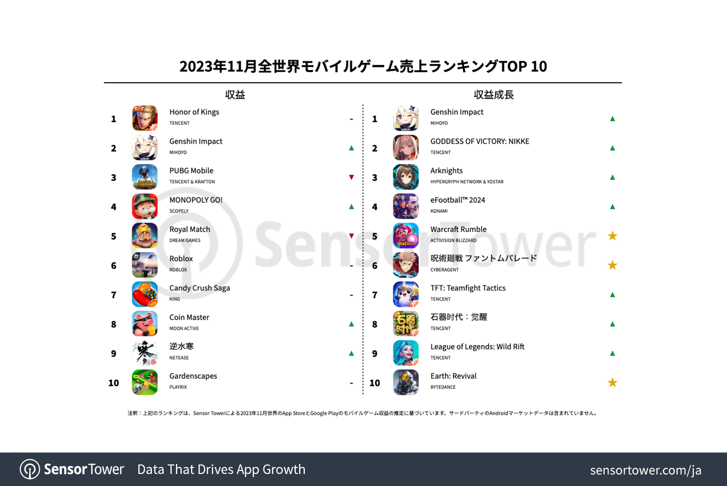 Sensor Towerのストアインテリジェンスデータによると、Tencentの『Honor of Kings』が2023年11月の全世界App StoreとGoogle Playで1億9,300万ドルの収益を記録し、グローバルモバイルゲーム収益ランキング1位となりました。同作は11月3日に新英雄ドリアの体験イベントや姜子牙の新しいスキンなどのコンテンツ更新を行い、当該期間においてデイリー収益でピークを迎えました。グローバル人気モバイルゲーム収益TOP 10の全体データは、上記のチャートをご参照ください。※上記のデータには、サードパーティのAndroidマーケットデータは含まれておりません。