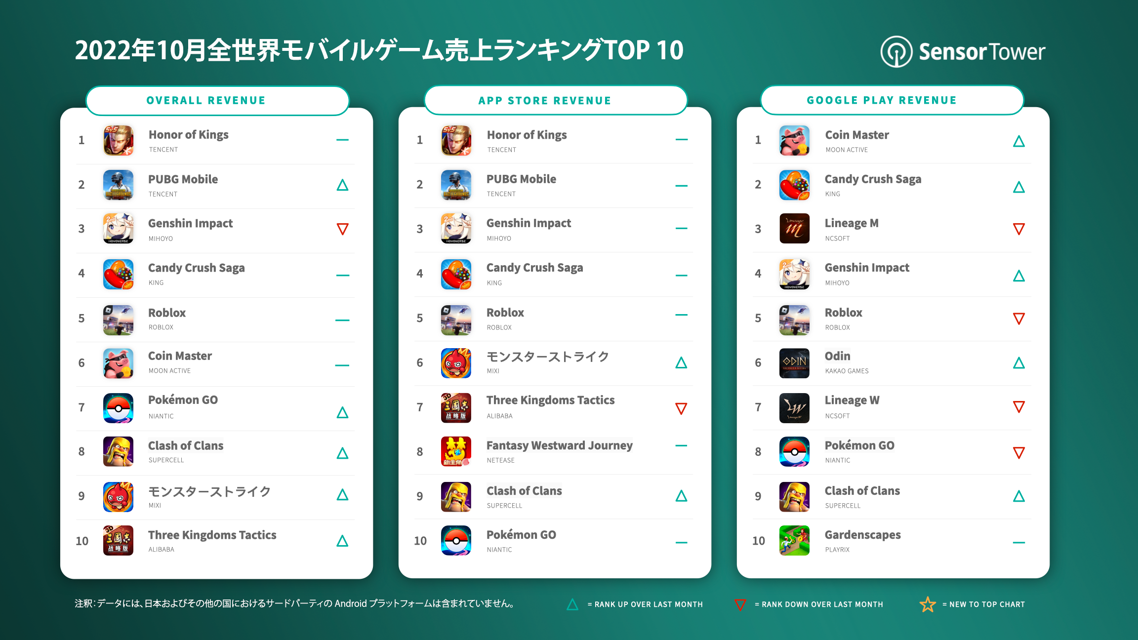 Sensor Towerのストアインテリジェンスデータによると、Tencentの『Honor of Kings』が2022年10月の全世界App StoreとGoogle Playで約2億1,000万ドルの収益を記録し、グローバルモバイルゲーム収益ランキング1位となりました。『Honor of Kings』の収益は中国のiOS市場からの収益が95.1%を占め、その他の国からの収益が4.9%を占めました。グローバル人気モバイルゲーム収益TOP 10の全体データは、上記のチャートをご参照ください。 ※上記のデータには、サードパーティのAndroidマーケットデータは含まれておりません。