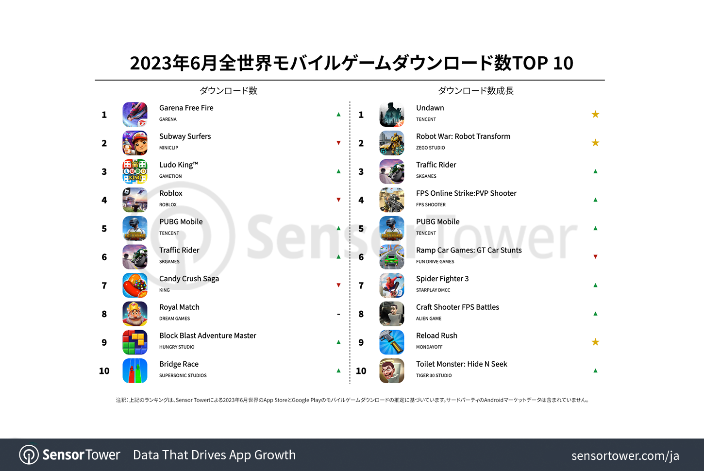 Sensor Towerのストアインテリジェンスデータによると、2023年6月に世界で最もダウンロードされたモバイルゲームはGarenaの『Free Fire』(『Free Fire MAX』を含む)で、約1,900万ダウンロードを記録しました。この期間中に『Free Fire』のダウンロード数が最も多かった国はインドで全体の27.9%、次にインドネシアとベトナムの市場が続き、それぞれ12.7%と8.1%を占めています。6月2日には、映画『スパイダーマン: アクロス・ザ・スパイダーバース』のコラボレーションによって、新しいアイテム、カード収集イベント、限定のランニングモードなどのアップデートが導入され、ゲームのダウンロード数が大幅に増加し、ダウンロードチャートのトップに輝きました。全世界人気モバイルゲームダウンロード数TOP 10の全体ランキングは、上記のチャートをご参照ください。※上記のデータには、サードパーティのAndroidマーケットデータは含まれておりません。