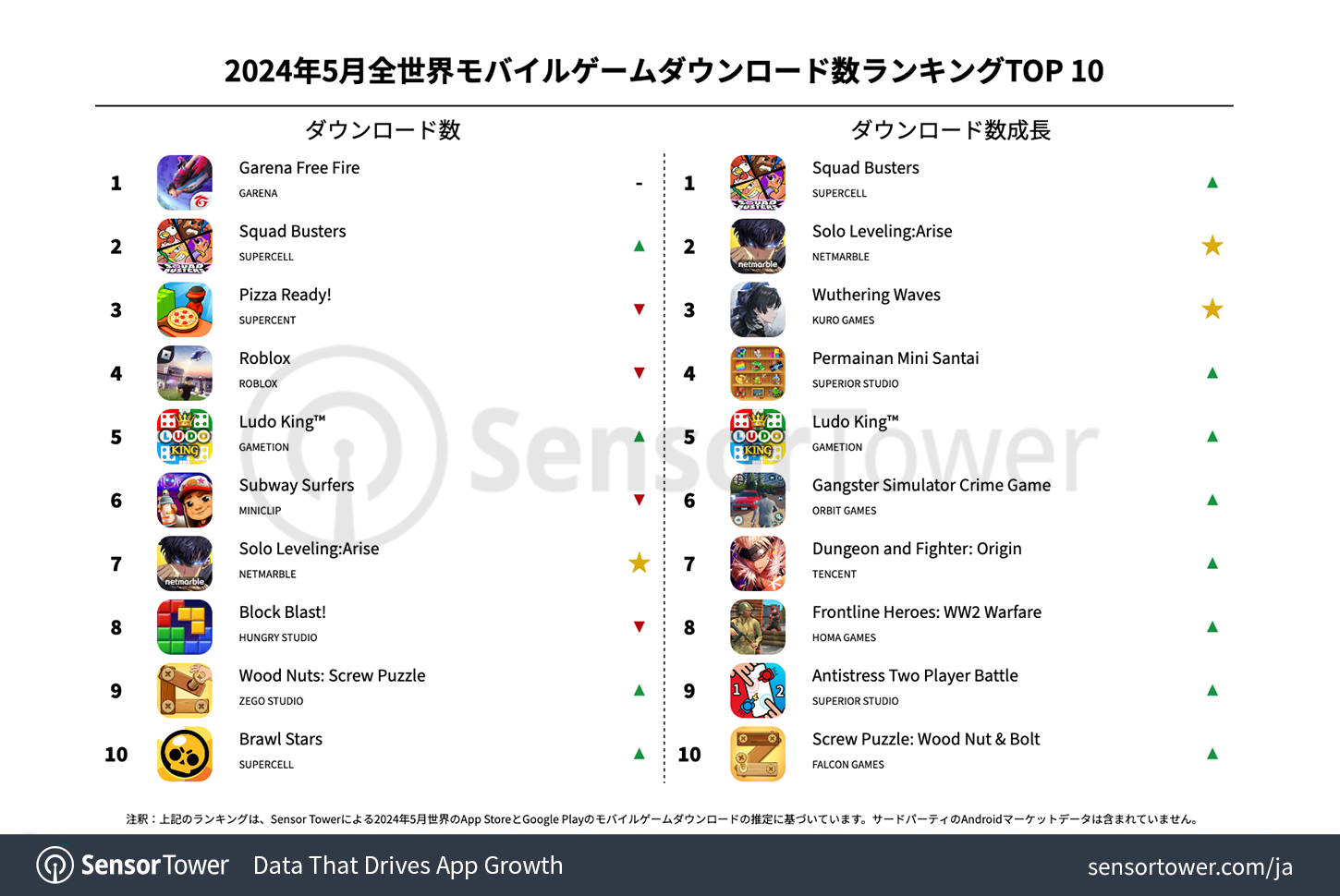 5月には、Netmarbleの『Solo Leveling: Arise』(俺だけレベルアップな件:Arise)、Kuro Gamesの『Wuthering Waves』(鳴潮)、Tencentの『Dungeon & Fighter: Origin』の3つの新しいモバイルゲームがダウンロード数成長ランキングの上位に入りました。