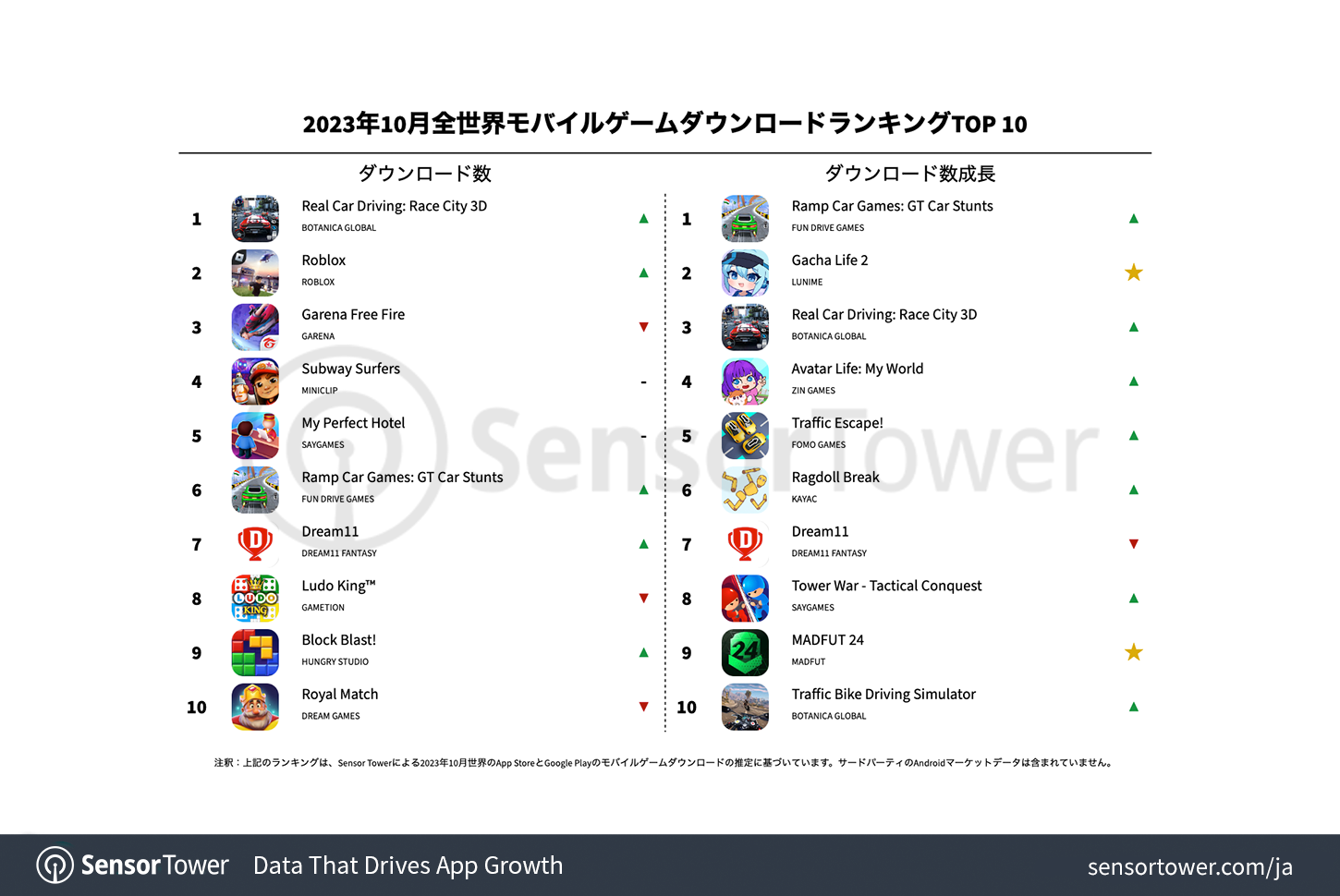 Sensor Towerのストアインテリジェンスデータによると、2023年10月に世界で最もダウンロードされたモバイルゲームはBotanica Globalの『Real Car Driving: Race City 3D』で、1,900万以上ダウンロードを記録しました。この期間中に同作のダウンロード数が最も多かった国はインドで全体の26.4%、次にブラジルとメキシコの市場が続き、それぞれ12%と7%を占めています。シンプルで使いやすい操作と極小のインストールパッケージのおかげで、このゲームは新興市場の主要なAndroidデバイスに適しており、短期間で多くのダウンロードを獲得しました。10月のゲームの最適化を通じて、このゲームはダウンロード数ランキングでトップに躍り出ただけでなく、リリース以来の最高の月間ダウンロード数を達成しました。同パブリッシャーのもう一つのモバイルシミュレーションゲーム、『Traffic Bike Driving Simulator』もダウンロード数成長ランキングに入りました。全世界人気モバイルゲームダウンロード数TOP 10の全体ランキングは、上記のチャートをご参照ください。 ※上記のデータには、サードパーティのAndroidマーケットデータは含まれておりません。